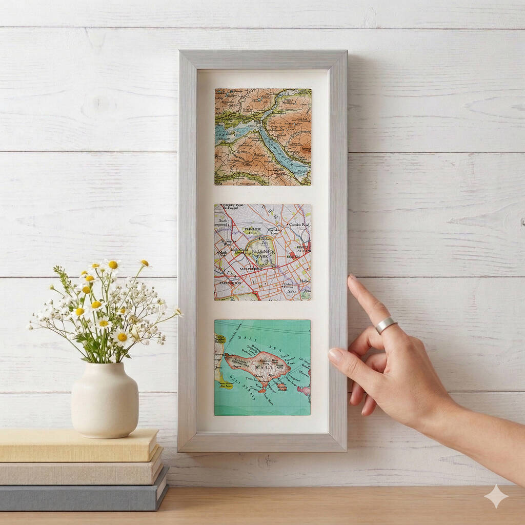 Framed map wall art print. A thoughtful and personalised special birthday gift. Choose three personalised map locations of anywhere in the world. Unique milestone triptych.