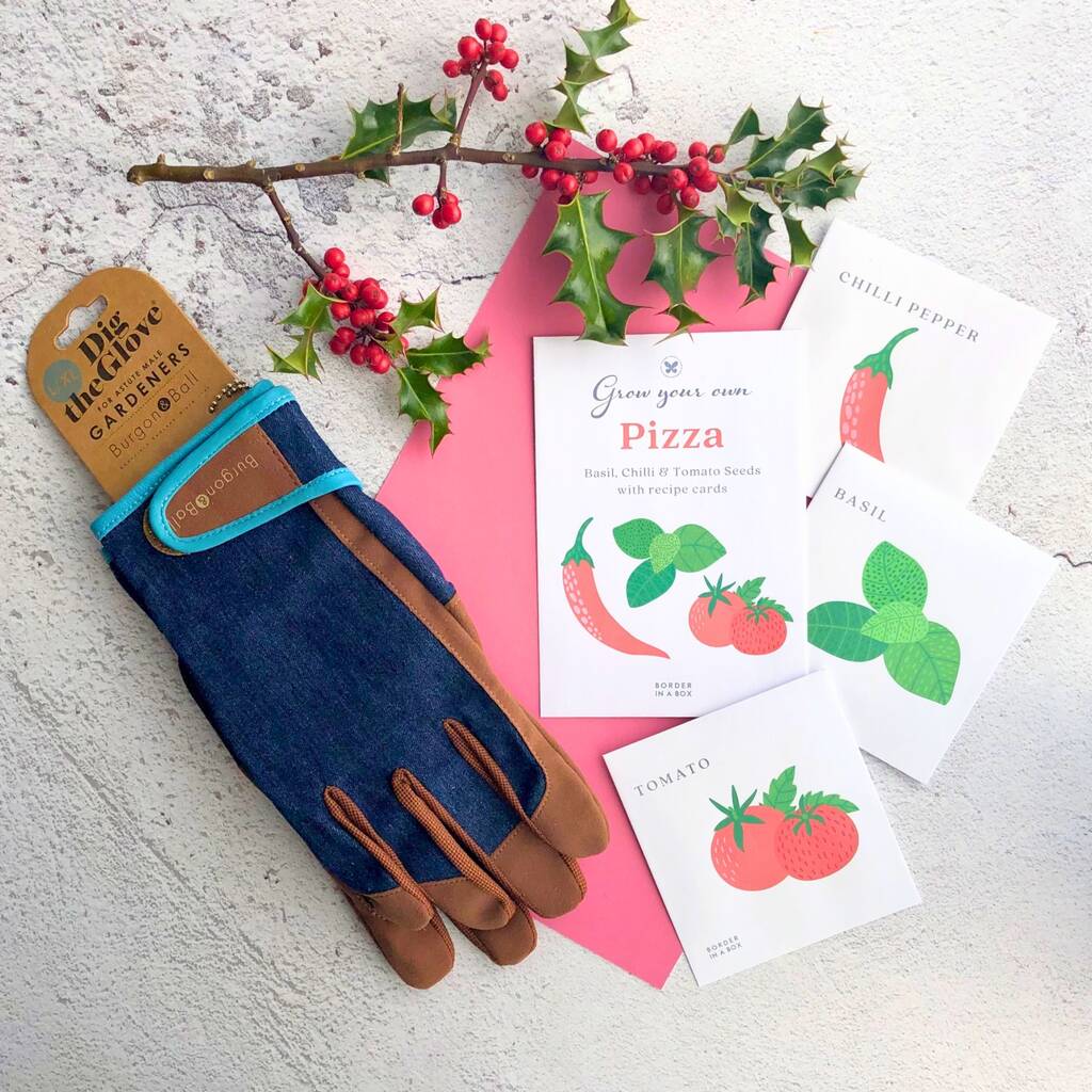 Luxury Mens gardening gloves gift for a style conscious man, which includes a personalised "Grow Your Own" Pizza seed and recipe gift set