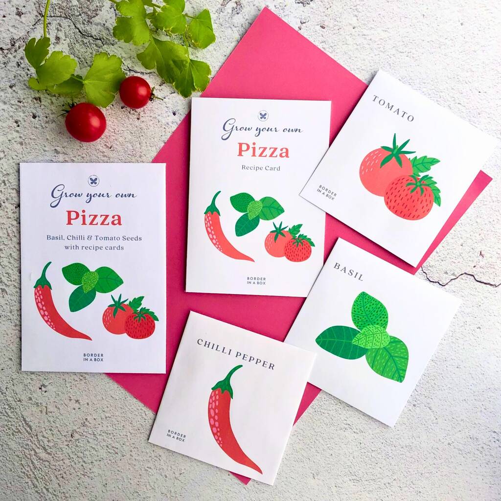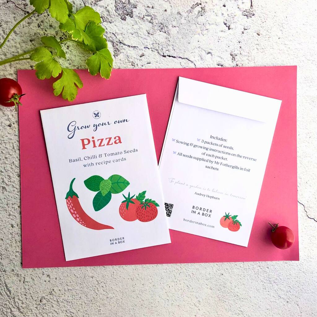 The seed gift pack contains three packets of seeds to sow and grow tomatoes, chillis and basil along with a recipe card to make delicious pizza toppings such as chilli hot sauce, basil creamy pesto and a speedy tomato sauce.