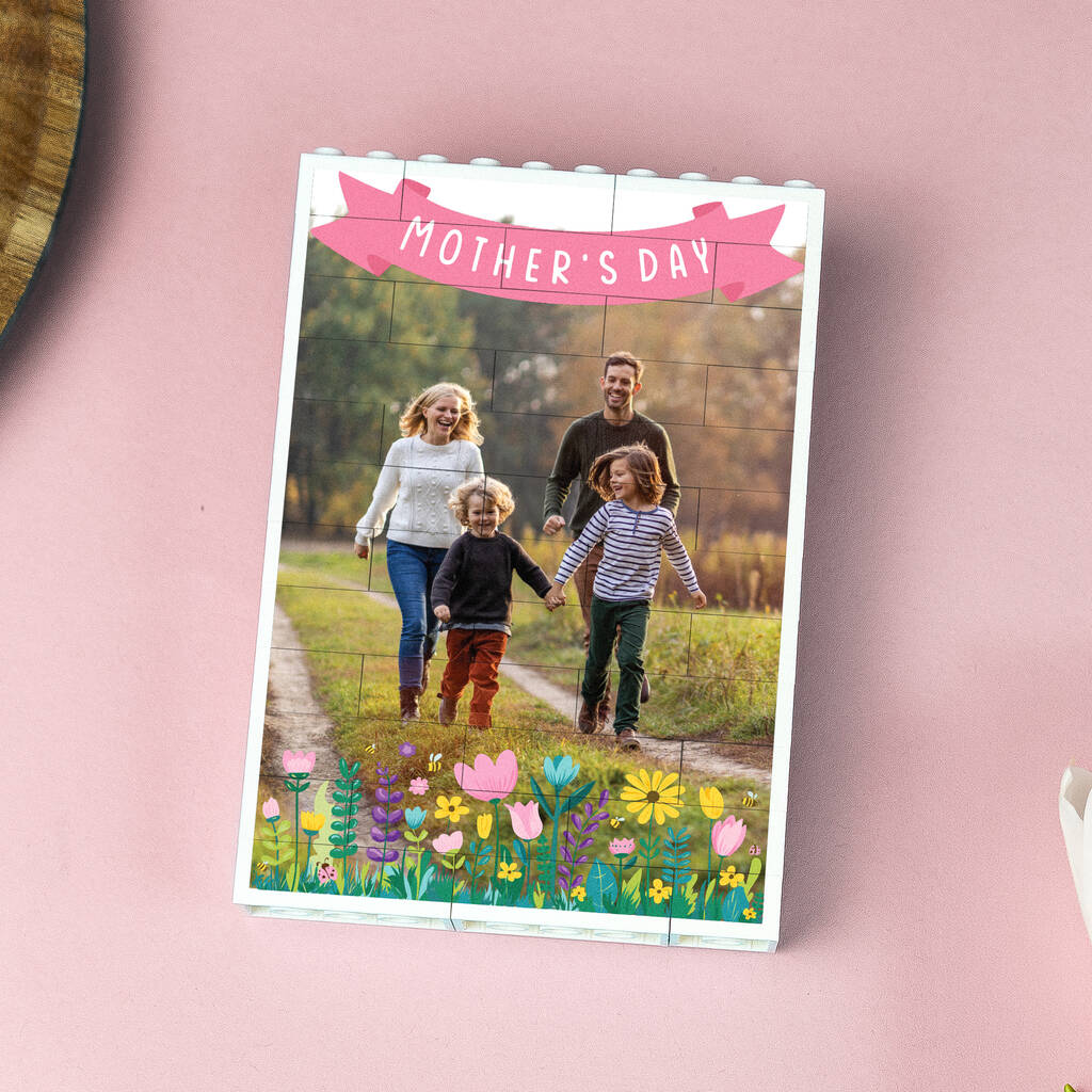 Create a personalised LEGO® brick Mother's Day photo block featuring your favourite image, Mother's Day banner and floral graphic at the base of your photo