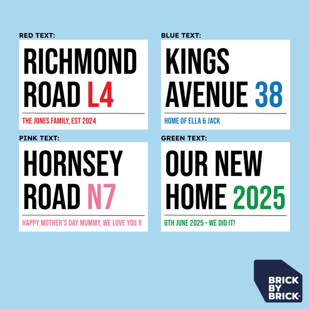 Enter your street address, house number and add a short personalised message (e.g. “Our First Home”, “The Smith Family”, or a meaningful date). Also choose your preferred highlight text colour: red, blue, pink, green or grey.