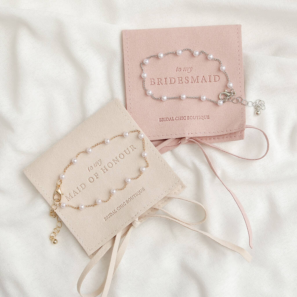 Dainty bracelet plated in 18k gold or silver — a thoughtful gift for your bridesmaid or bridal party, wrapped in a keepsake pouch.Celebrate your bridal party with this elegant and timeless bracelet – a thoughtful gift for your bridesmaids, maid of honour, flower girl, mother of the bride, etc. Made from stainless steel and plated in 18k gold or silver, it's designed to last well beyond the big day.