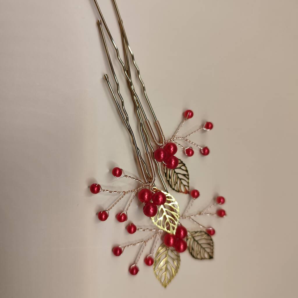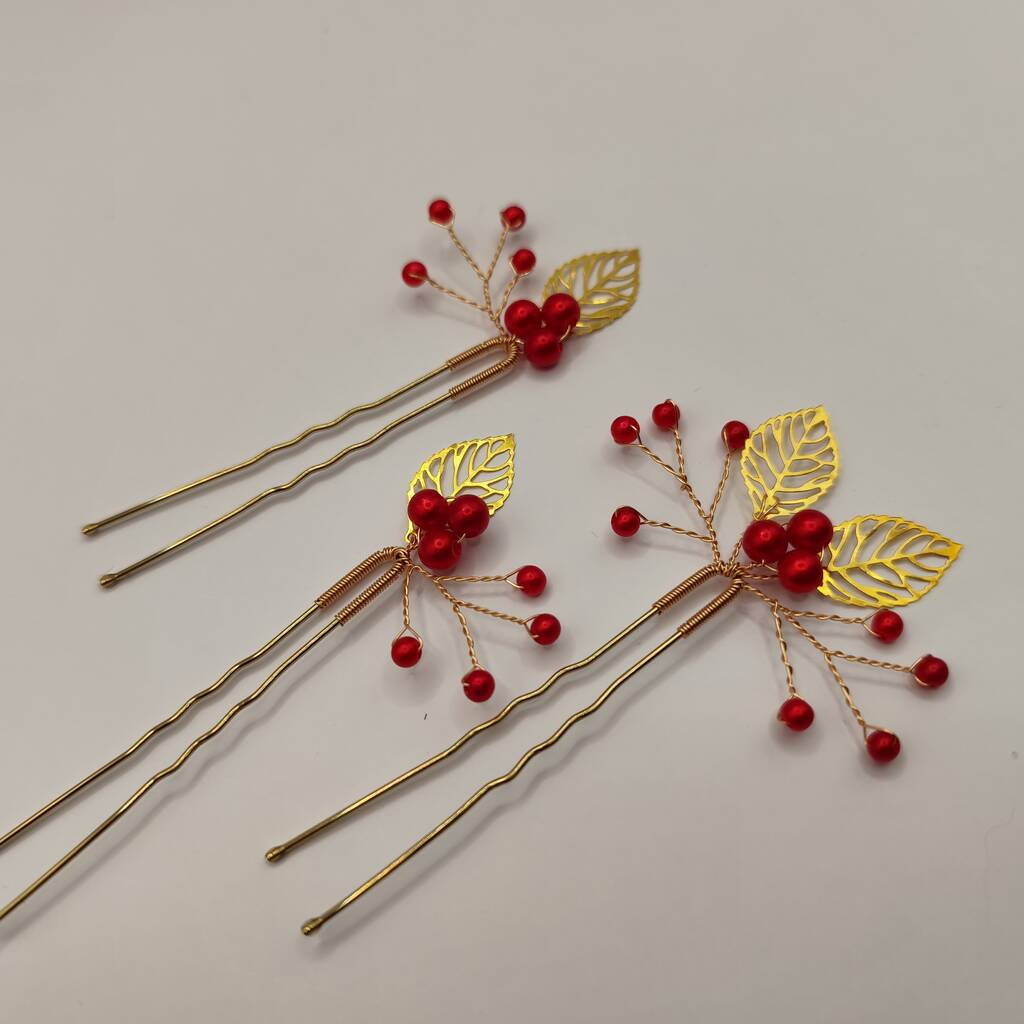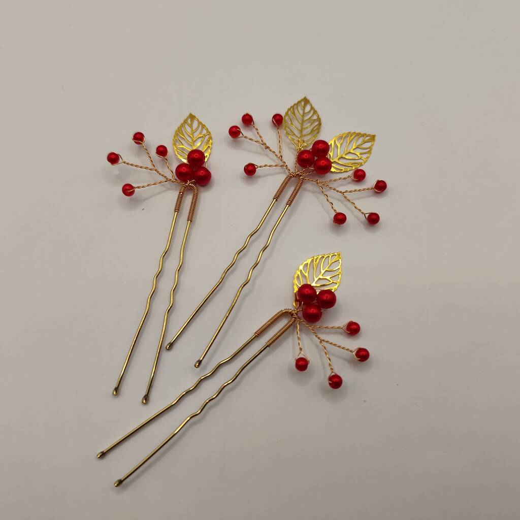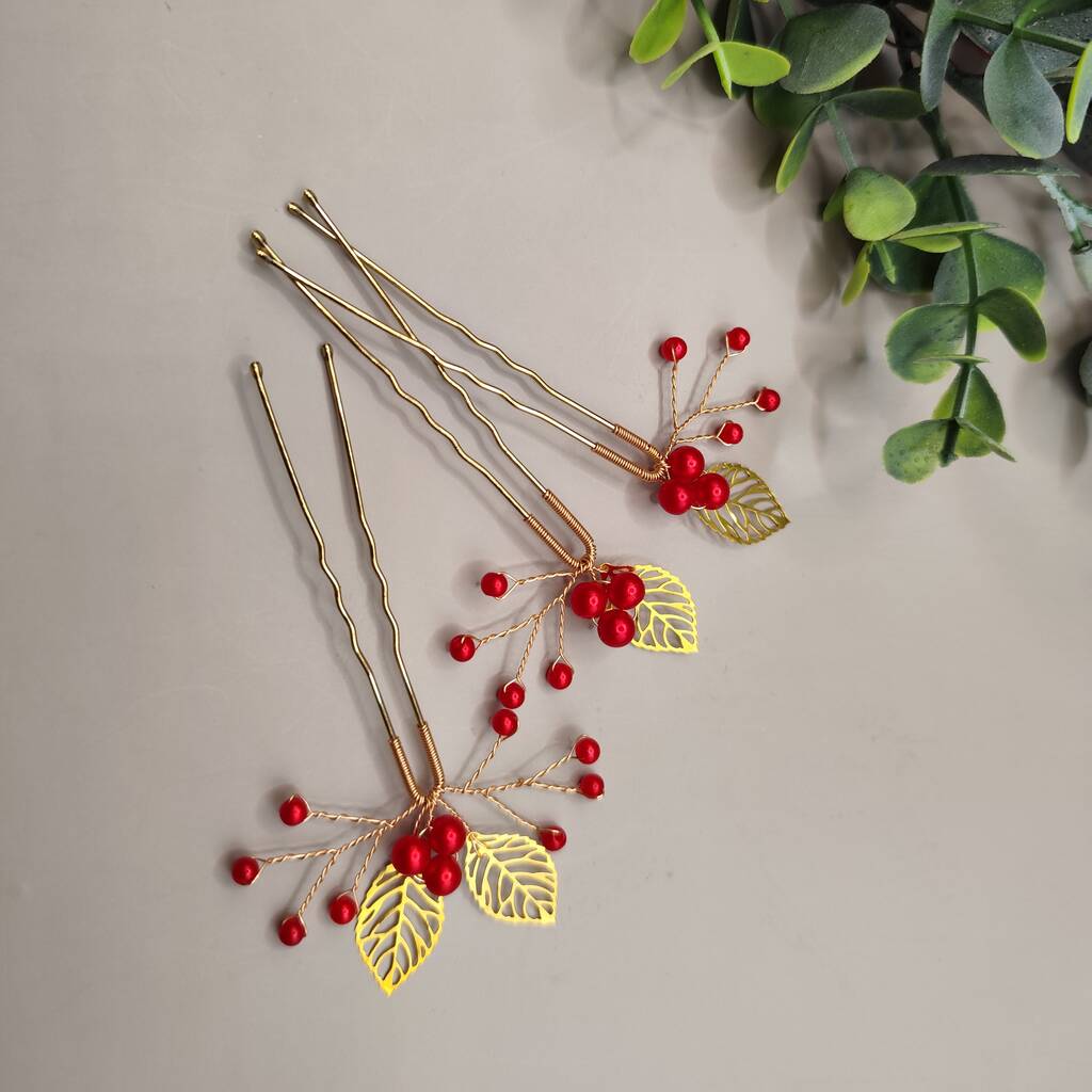 Red Berry And Gold Leaf Christmas Hair Pin Set – 3pcs
