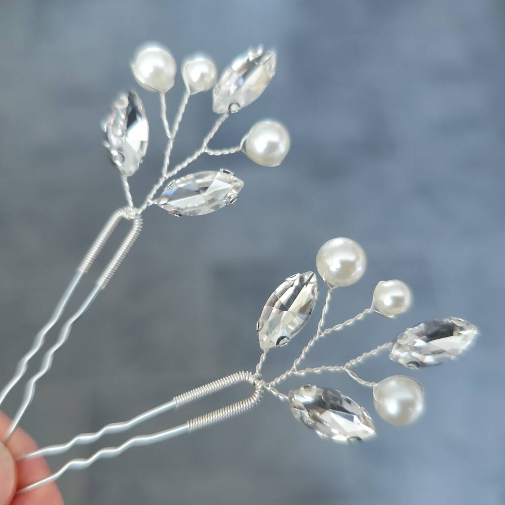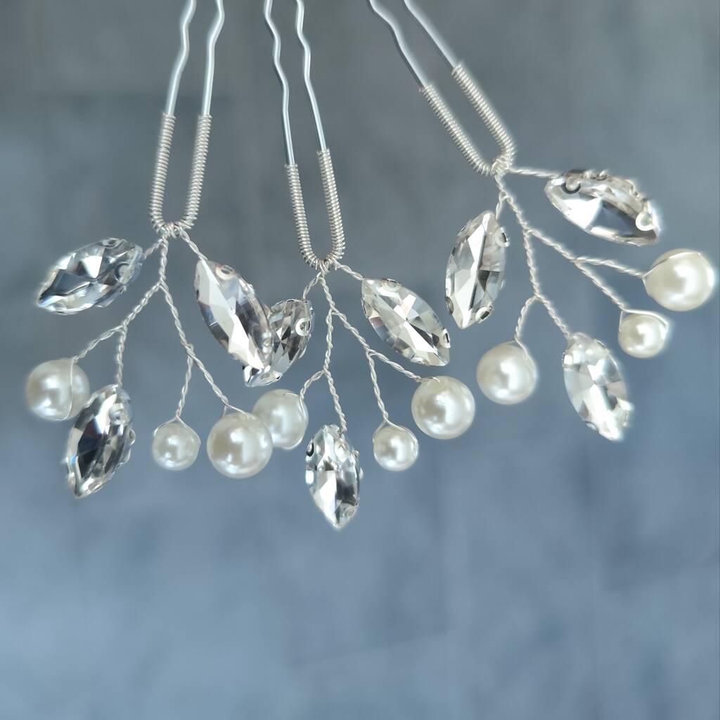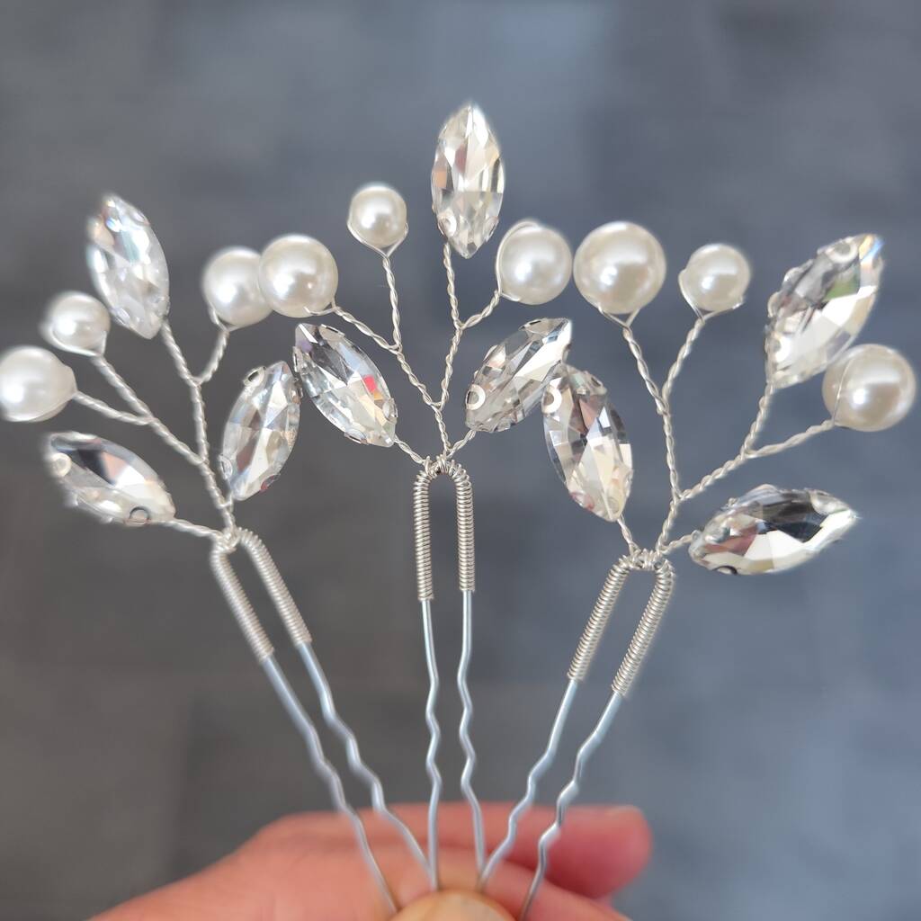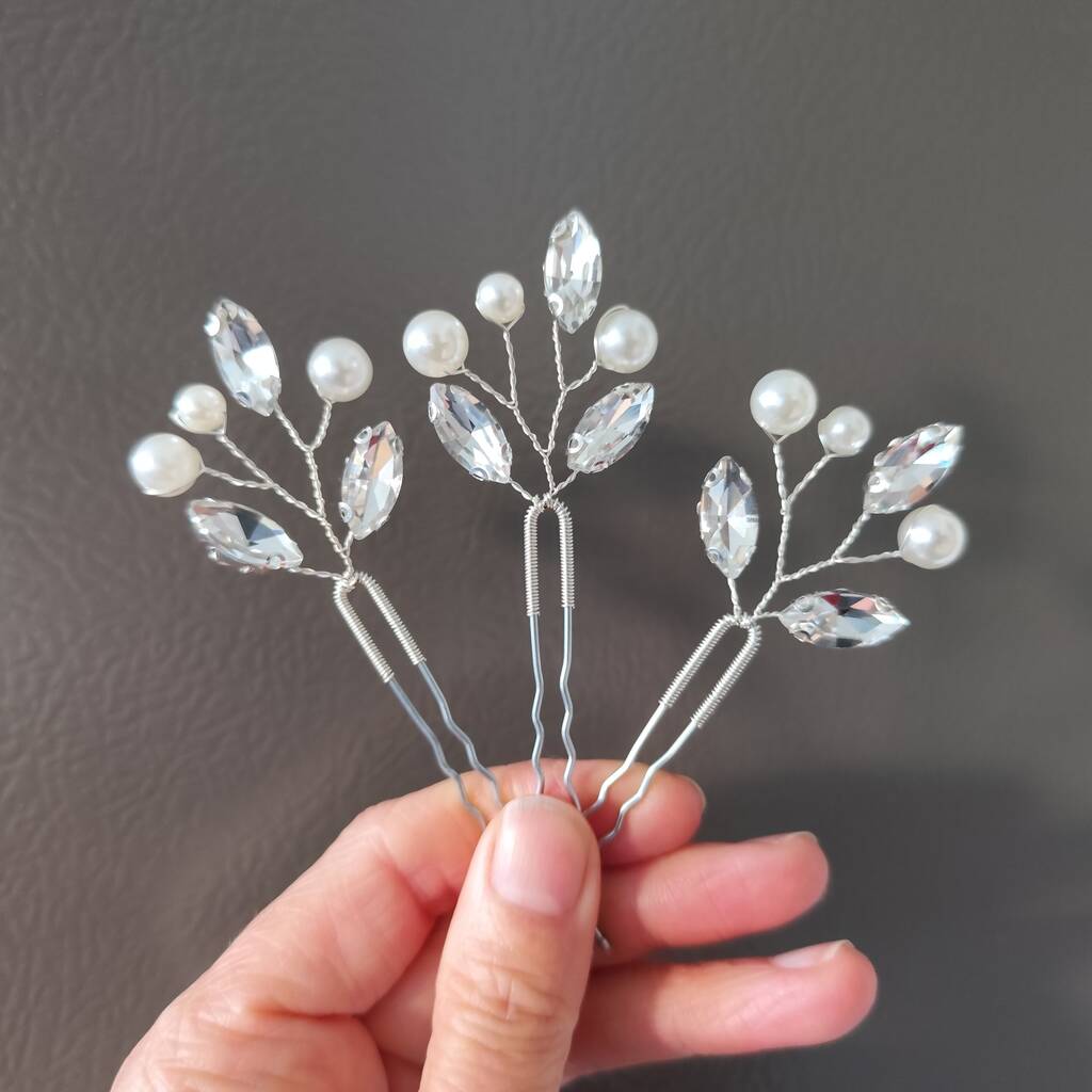 Bridal Hair Pins Set of 3 is perfect for Wedding Hair Accessories for Brides & Bridesmaids,mother of the bride,mother of the groomThis delicate set includes three handcrafted hair pins featuring shimmering clear crystals and luminous pearls, beautifully arranged on silver wire. Designed to complement bridal hairstyles, these pins bring a touch of elegance and sparkle to your special day.