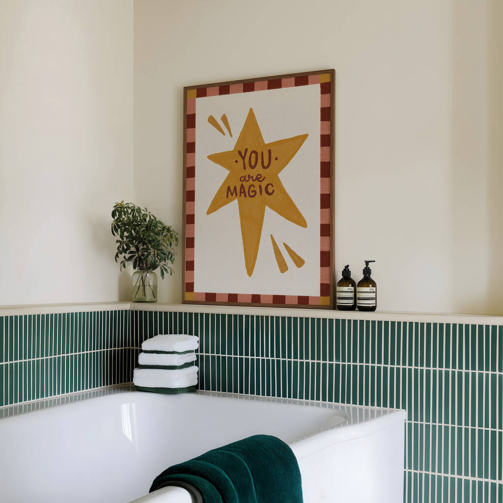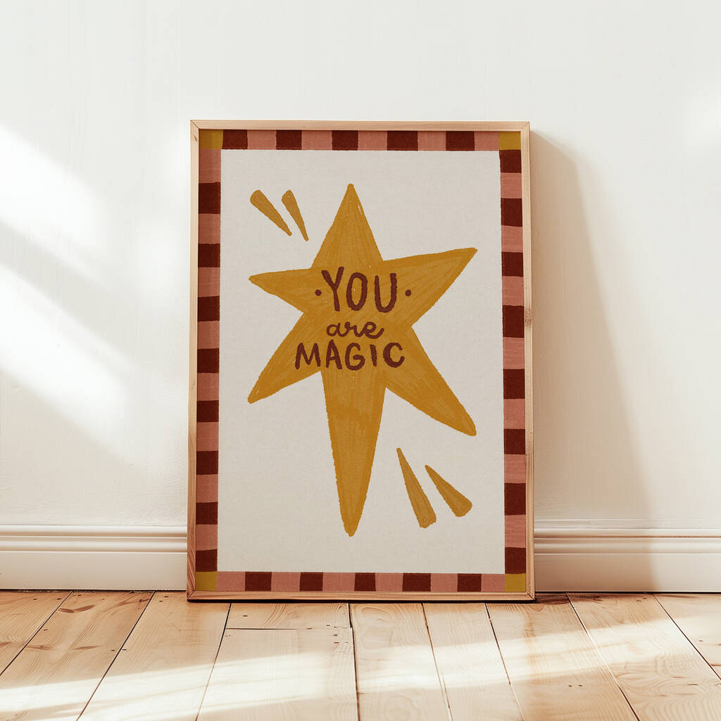 A hand-lettered, feel-good art print to brighten any nursery or playroom. Bold, joyful and designed to remind little ones just how magical they are.Brighten up your nursery, playroom or gallery wall with this joyful, hand-lettered art print. “You Are Magic” is a bold, uplifting reminder for little ones (and grown-ups too!) that they’re something truly special. Designed in Brighton and created using a mix of hand-drawn and digital techniques, this piece adds warmth, positivity and personality to any space. Printed on high-quality art paper and available framed or unframed, it makes a lovely gift for new parents, birthdays or just because. Perfect for homes filled with love, colour and creativity.