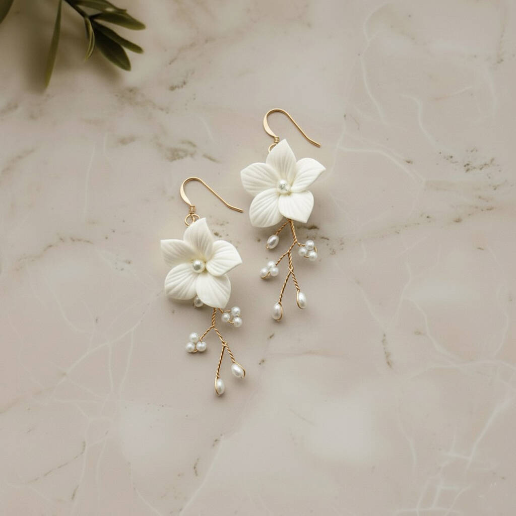 Choose from a soft gold or elegant silver finish to complement your gown and accessories. The warm gold tone pairs beautifully with ivory and champagne dresses, while silver suits cooler whites and contemporary styles. Each option features the same handcrafted clay flowers, seed beads and pearls, arranged by hand for a natural, organic feel. As every pair is made to order, subtle variations ensure your earrings are truly one of a kind — a small piece of artistry to treasure long after the day itself.