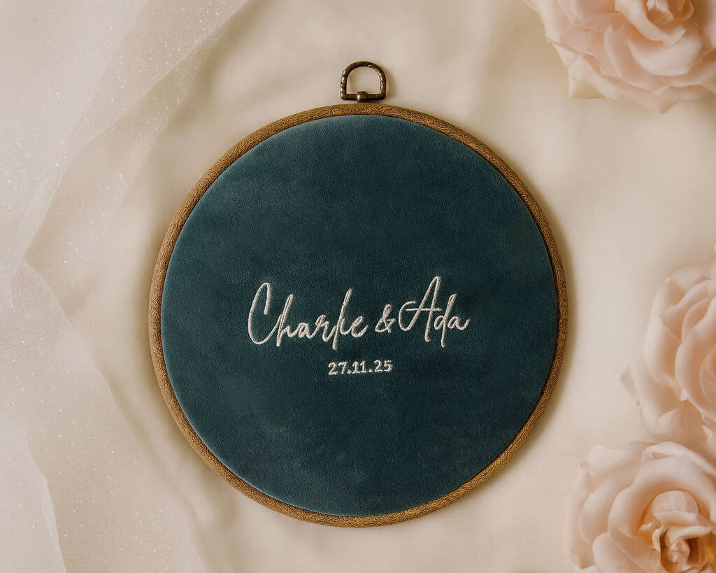 Why They'll Love It:* Personalised with the couple’s initials and wedding date* Beautifully embroidered onto plush velvet for a premium finish* Framed in a lightweight, realistic wood-effect hoop* A unique and thoughtful wedding keepsake* Ready to hang—no extra framing needed* Made in our studio in Bath, England with care and attention to detail