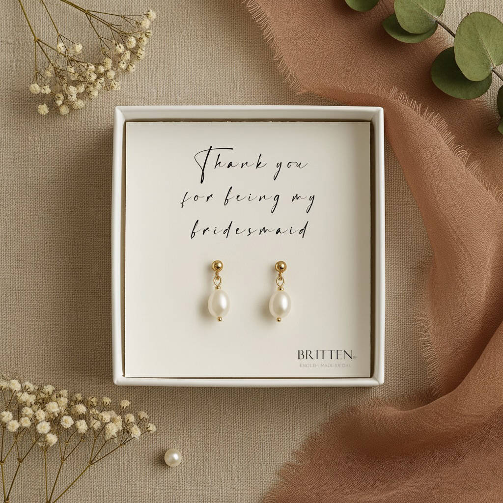 Freshwater pearl drop earrings — a “thank you” gift for your bridesmaids. Handmade in Bath, using genuine pearls and gold filled or sterling silver findings.