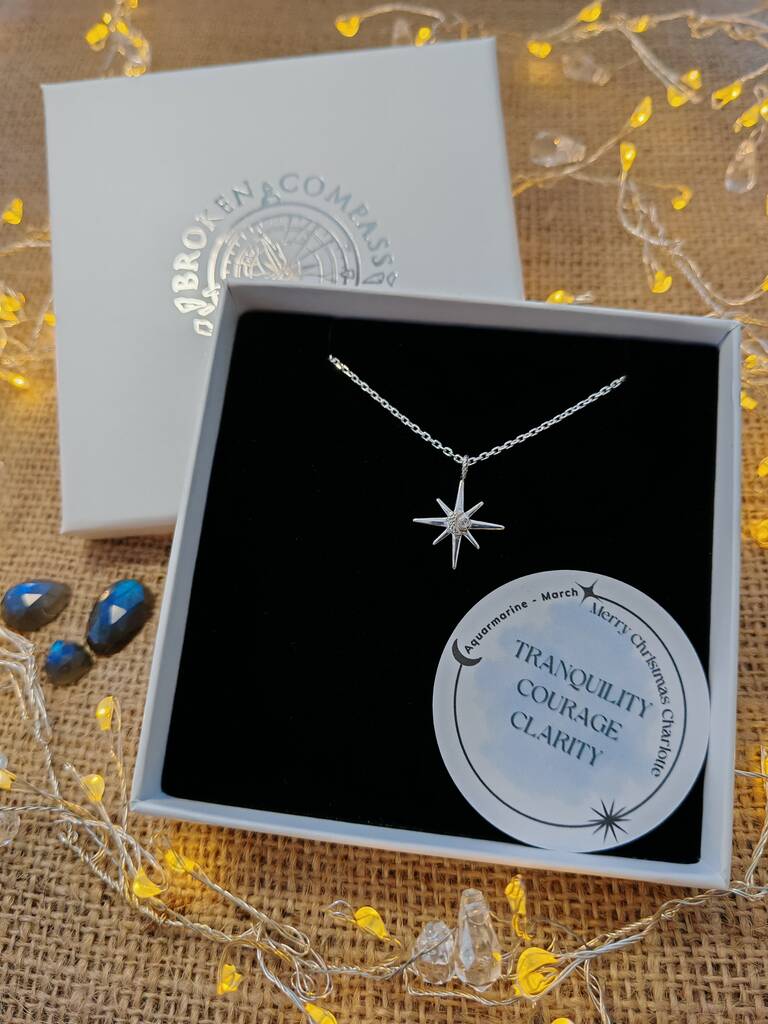 Gift a piece of the night sky this Christmas with a handmade Sterling Silver North Star & Moon Birthstone Necklace set with March’s birthstone, Aquamarine.