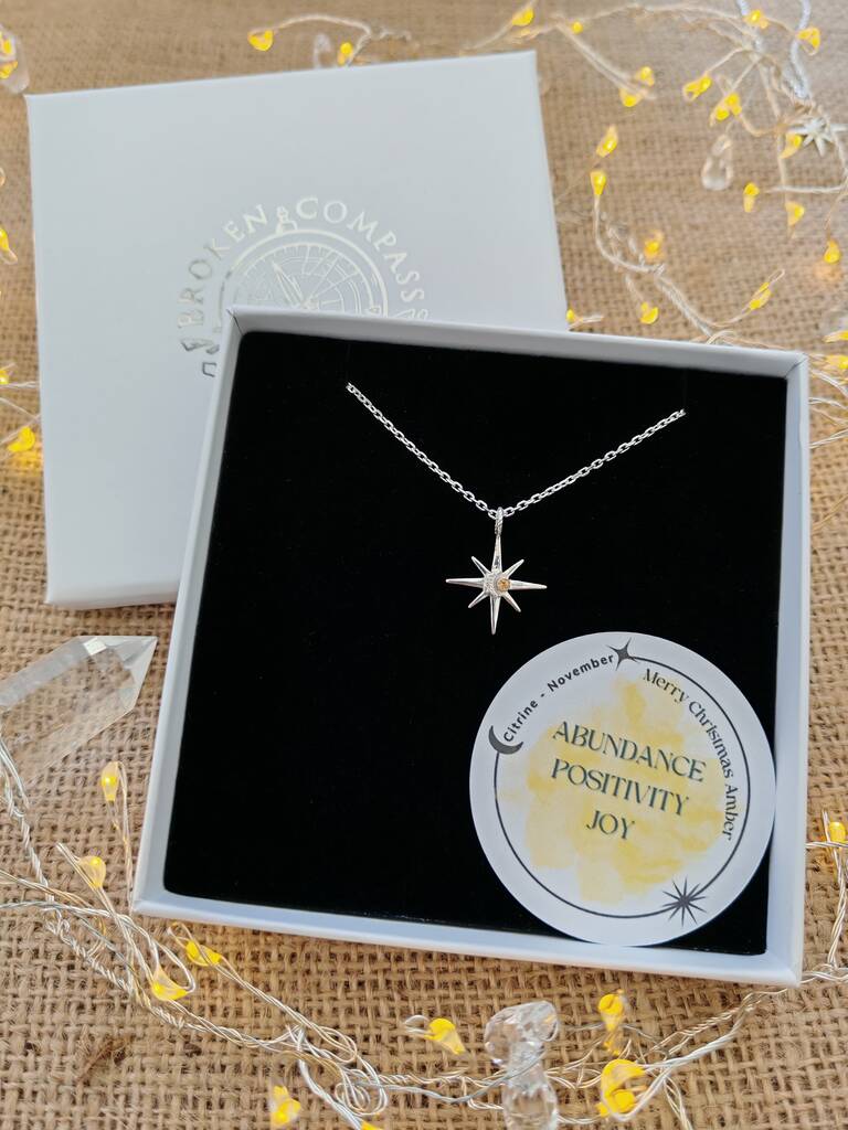 Gift a guiding star this Christmas with a handmade Sterling Silver North Star & Moon Birthstone Necklace set with November’s birthstone, Citrine.