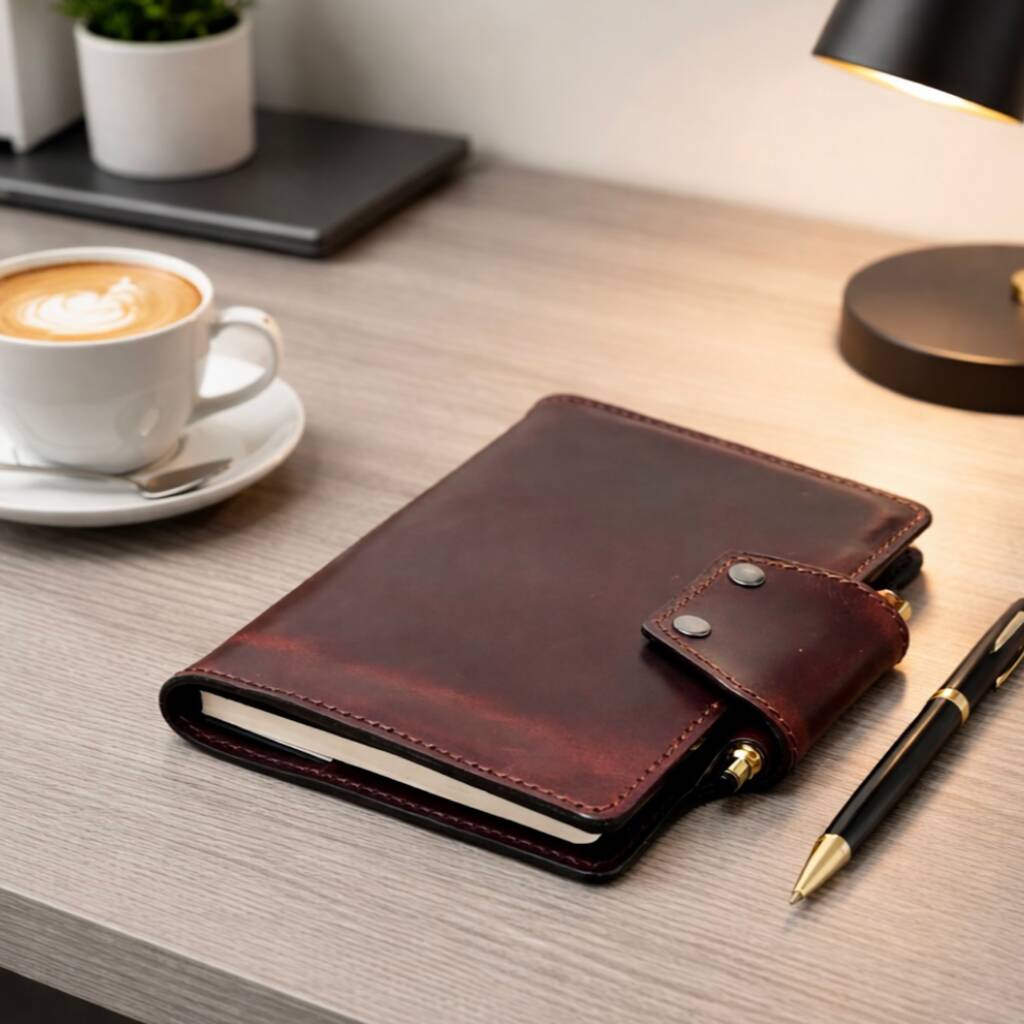 Personalisation will be stamped in the bottom right corner. Comes with lined note pad inside. Completely handmade and hand stitched from beautiful vegetable tanned top grain Lyveden distressed leather. Constructed from multiple pieces of leather and carefully glued, sanded, stitched and the edges dyed to give a premium finish. Lined note pad can easily replaced when full. Ideal gift for him or her.