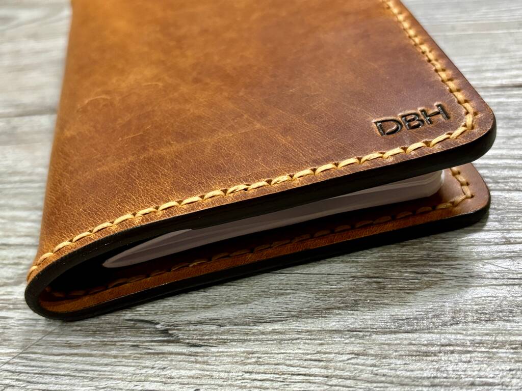 Personalisation will be stamped in the bottom right corner. Completely handmade and hand stitched from beautiful vegetable tanned top grain Lyveden distressed leather. Constructed from multiple pieces of leather and carefully glued, sanded, stitched and the edges dyed to give a premium finish. Ideal gift for him or her.