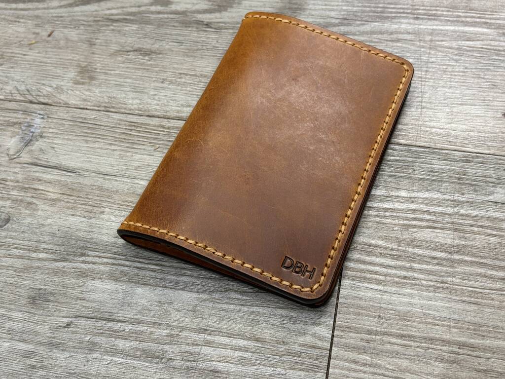 Personalised Burnt Tan luxury leather passport travel wallet. Completely handmade from distressed Lyveden leather with hand dyed edges for a premium finish.