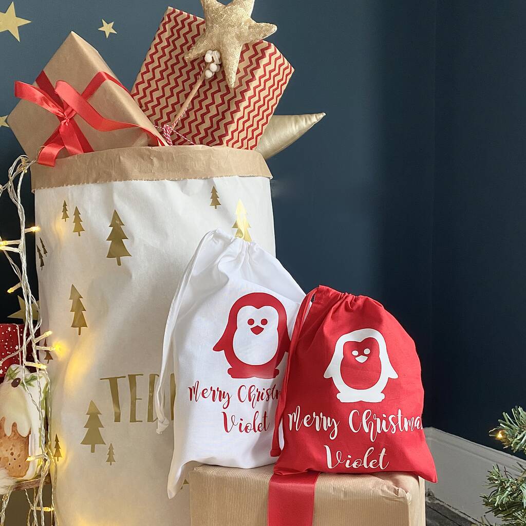 Featuring a cute and cuddly penguin with your chosen name below, each bag is crafted from high-quality cotton for a festive look that’s stylish and practical. Perfect for Christmas Eve surprises, they’re ideal for filling with small presents, treats, or keepsakes, and make a wonderful alternative to traditional stockings. These drawstring bags are also perfect for wrapping awkwardly shaped gifts with ease.
