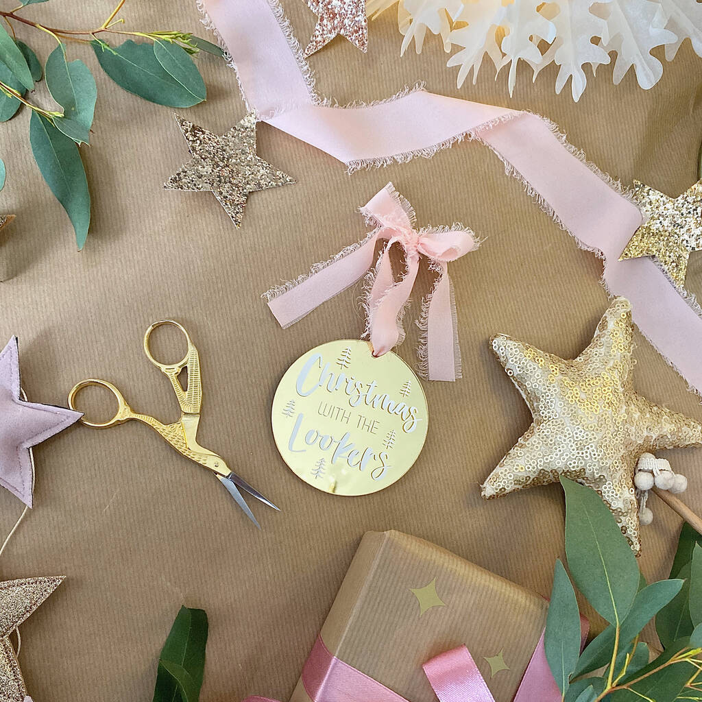 A luxury, personalised family name Christmas tree decoration with choice of chiffon ribbon or Liberty fabric.