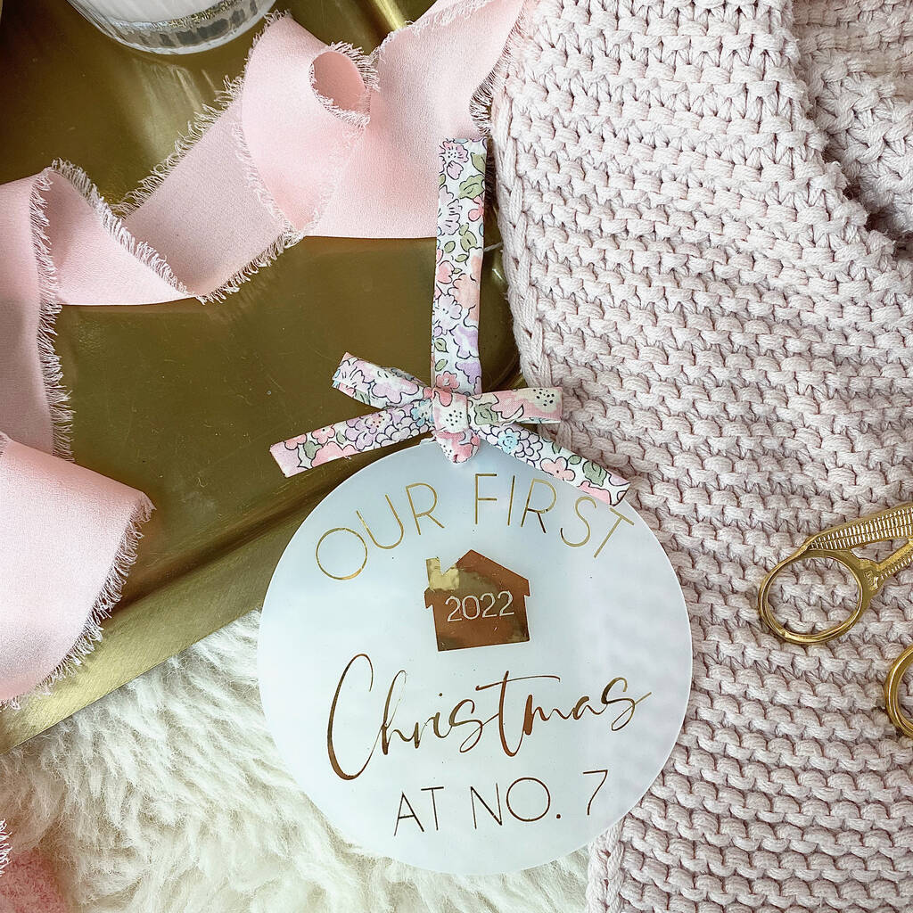 Celebrate a special milestone with these luxury personalised Christmas tree decorations, designed to mark a first Christmas in a new home.
