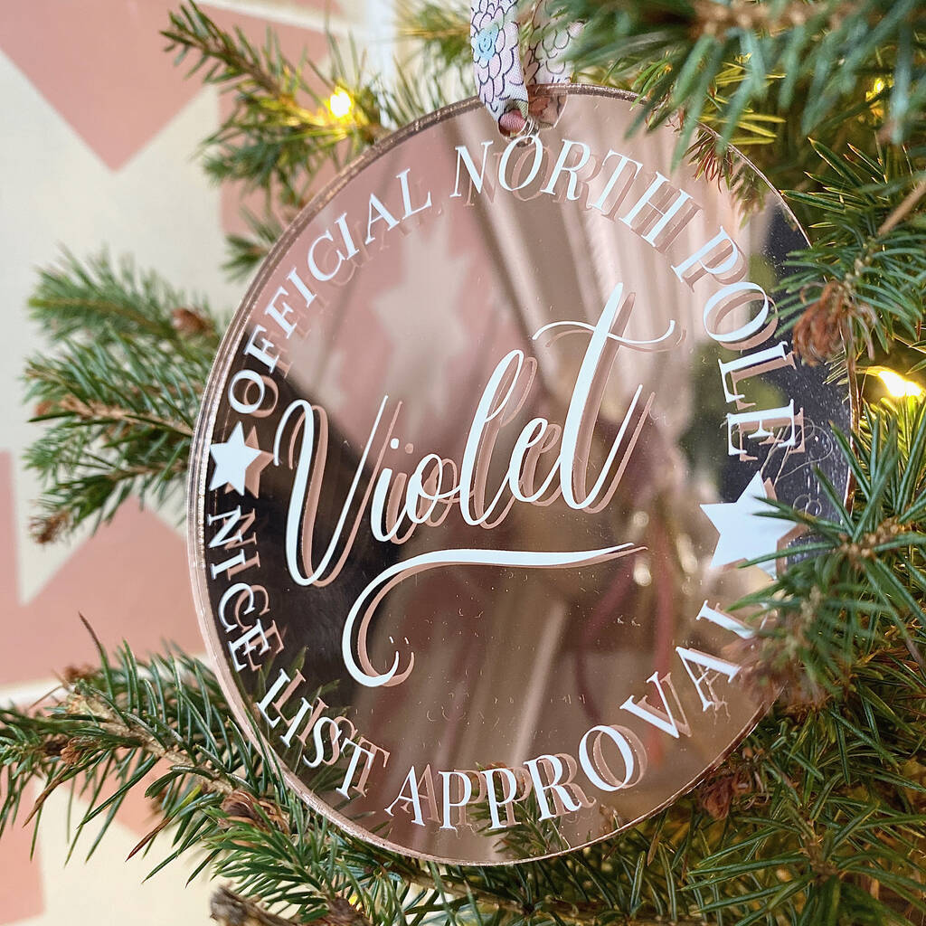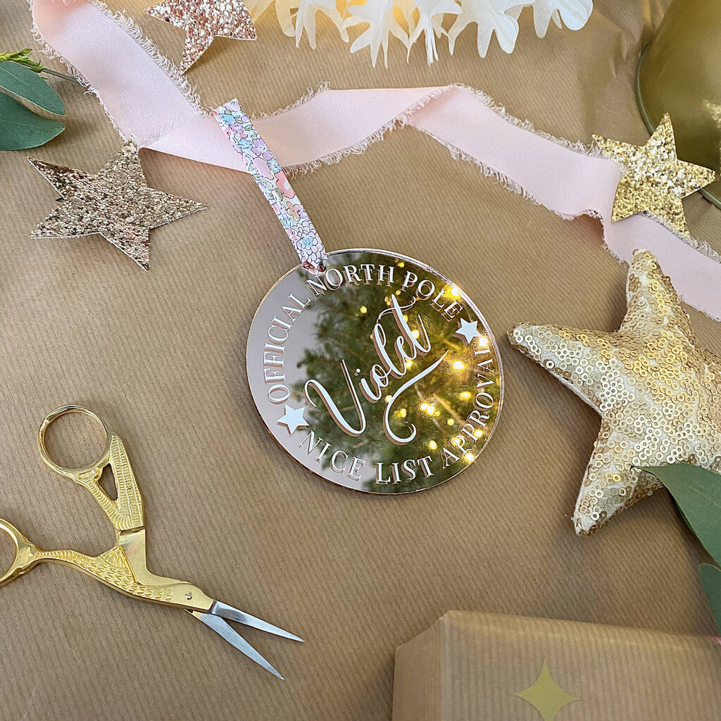A luxury, personalised 'Nice List' official Santa stamp tree decoration with choice of chiffon ribbon or Liberty fabric.