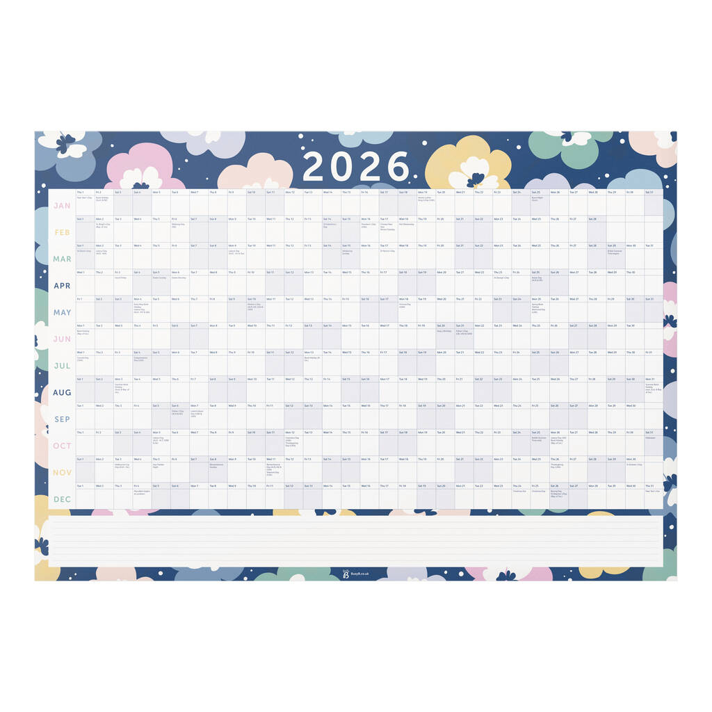 Wall Planner 2026 | Colourful Navy Floral Pattern | 2026 Yearly Planner | Year To View With Horizontal Monthly Planners And Notes