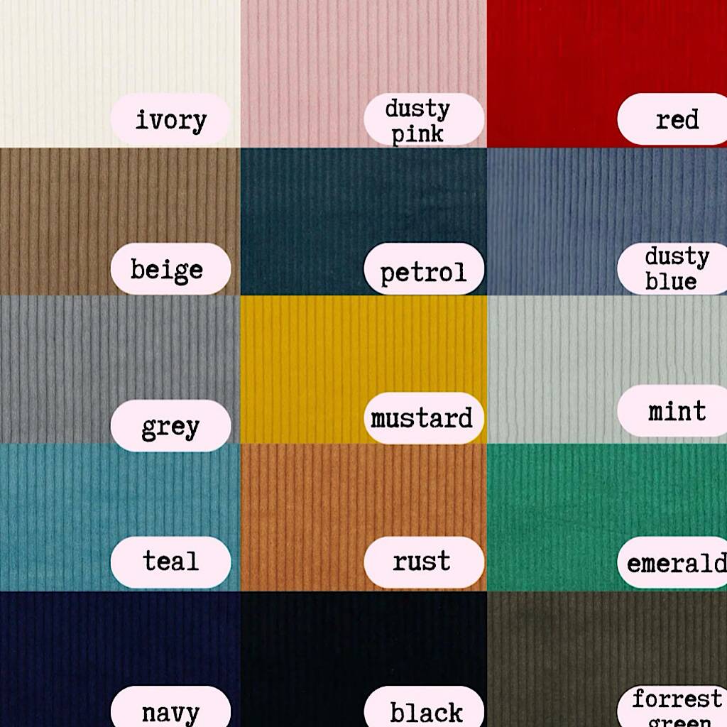 Fabric colour options; CORDUROY - Dusty Pink, dusty blue, Grey, Teal, Mustard, Rust, Forrest Green, emerald green, Ivory, red, navy, dusty blue, black, mint, beige , Petrol. BOUCLE - pink, ecru, off white, beige, sage,amber, grey