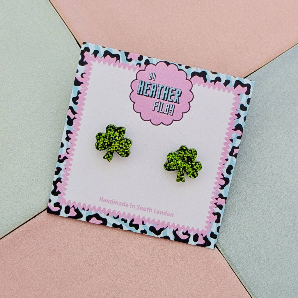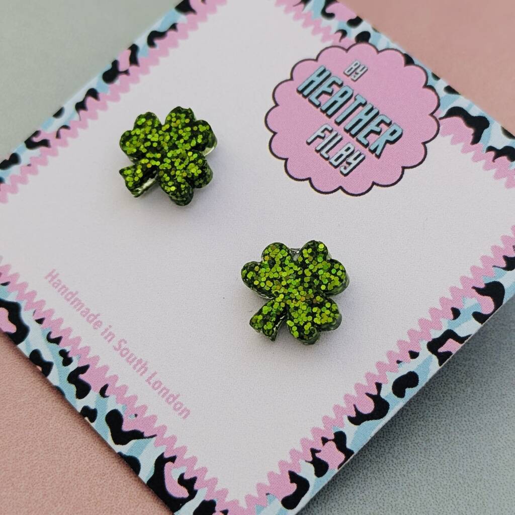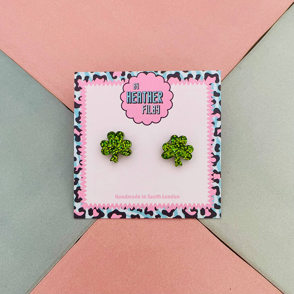 Add a touch of luck and Irish charm to your ensemble with our Green Clover Glitter Stud Earrings. Featuring a vibrant green clover design accented with shimmering glitter, these earrings are the perfect way to celebrate your heritage. Whether you're heading to a St. Patrick's Day party or simply want to showcase your love for all things Irish, these earrings are a must-have accessory. The stud style makes them easy and comfortable to wear all day and into the night. Add a little sparkle and a lot of luck to your jewelry collection with these stunning earrings.