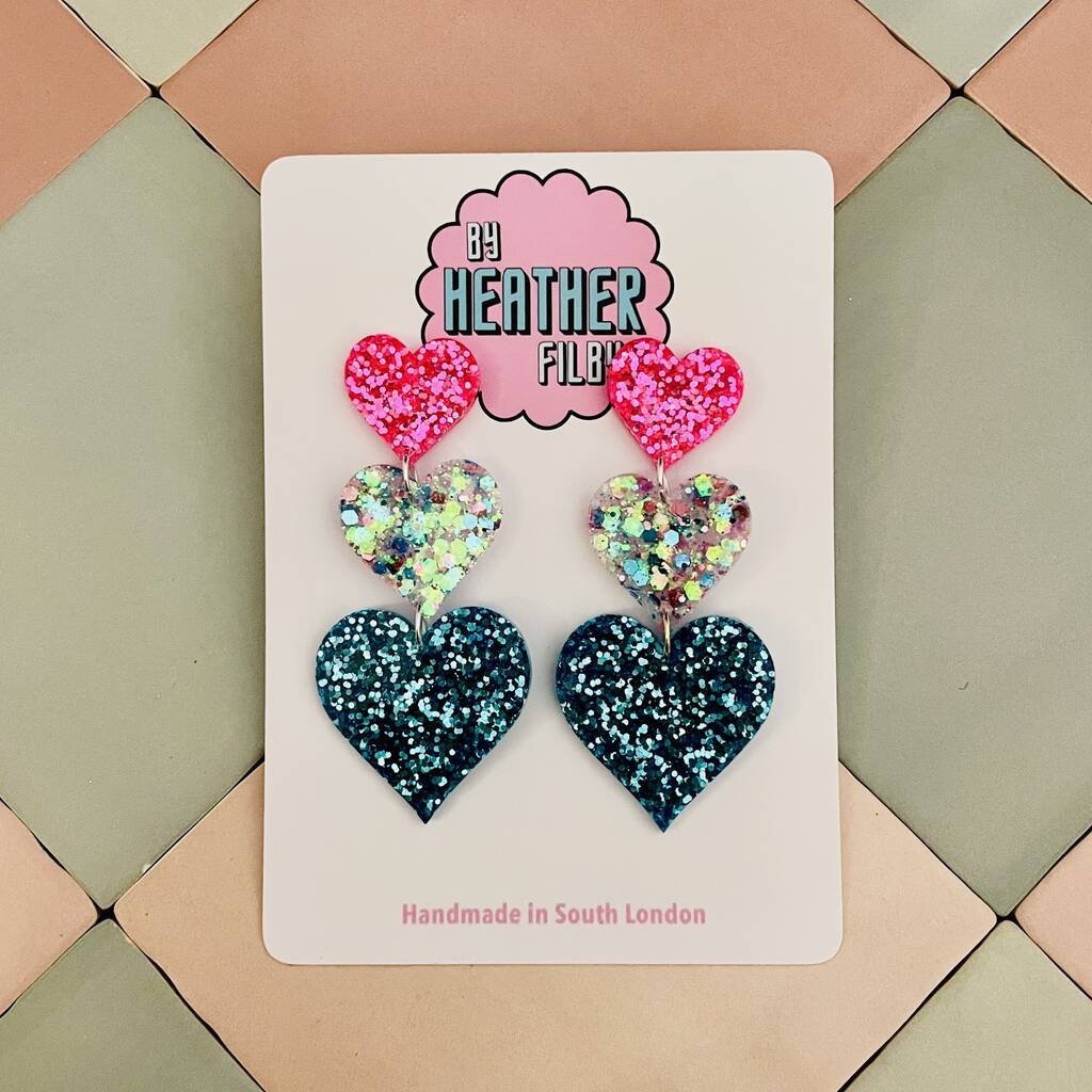 X Large Triple Heart Glitter Resin Earrings