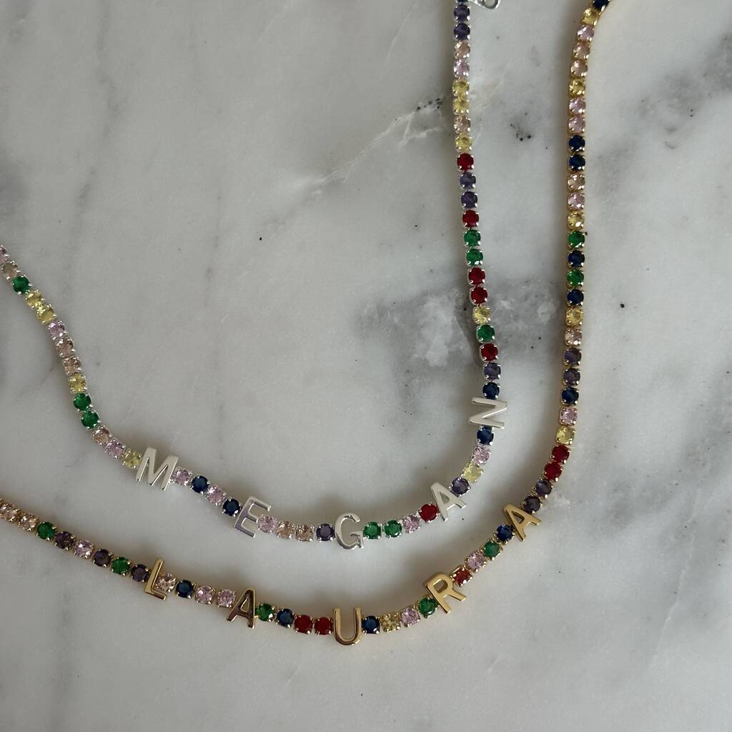 Personalised name tennis necklace with different coloured gem stones!