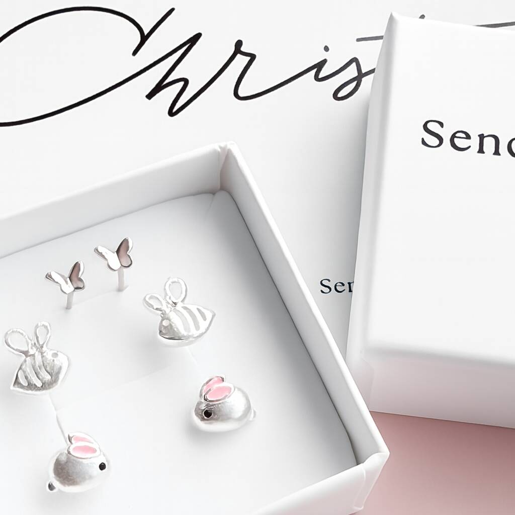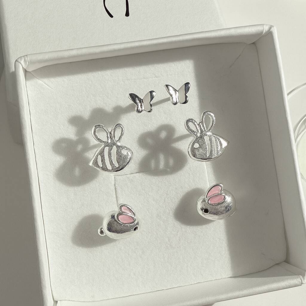 A sweet sterling silver earring set featuring three adorable pairs – bee, butterfly and rabbit designs. The perfect Christmas gift or stocking filler for little girls who love animals. Each pair is made from 925 sterling silver and comes beautifully gift-boxed and ready to give. Suitable for sensitive ears, these tiny treasures add a touch of sparkle and joy to everyday wear. A thoughtful Christmas or birthday gift idea from Sending Love Jewellery.
