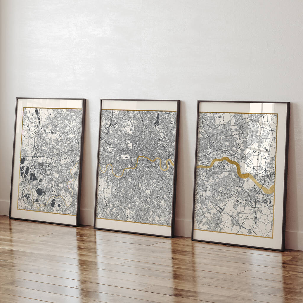 Personalised Triptych Map Prints With Metallic Leaf