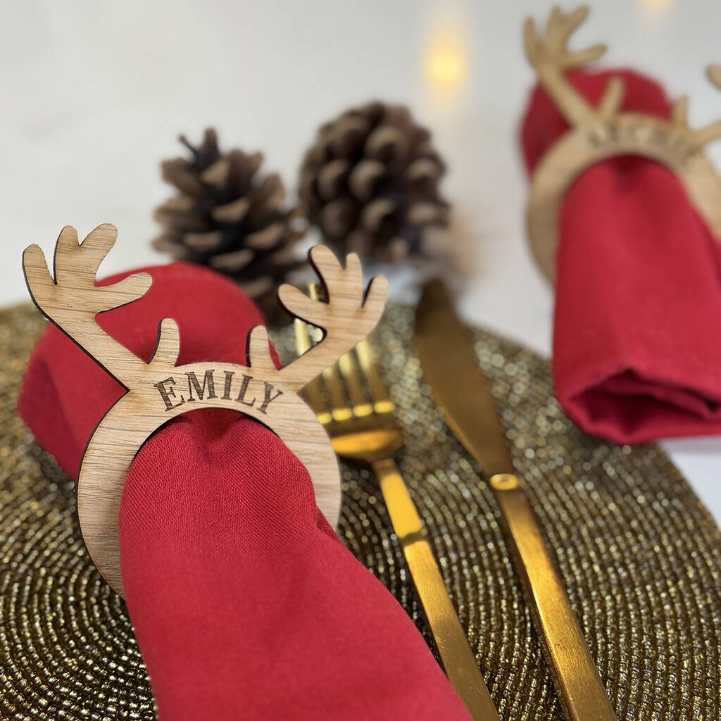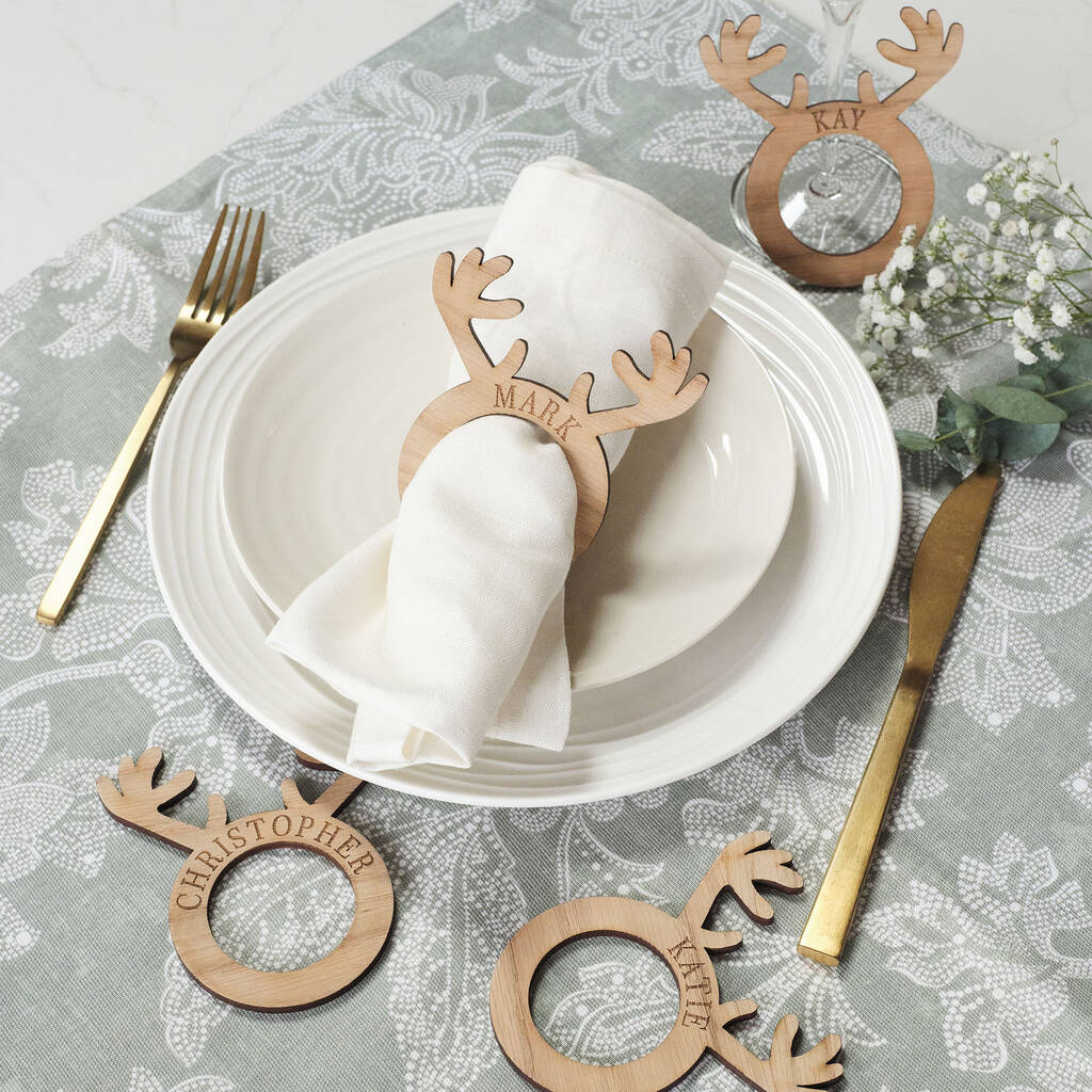 A beautiful personalised reindeer antler napkin ring place setting. Perfect for the Christmas table. Laser cut from sustainable oak wood.