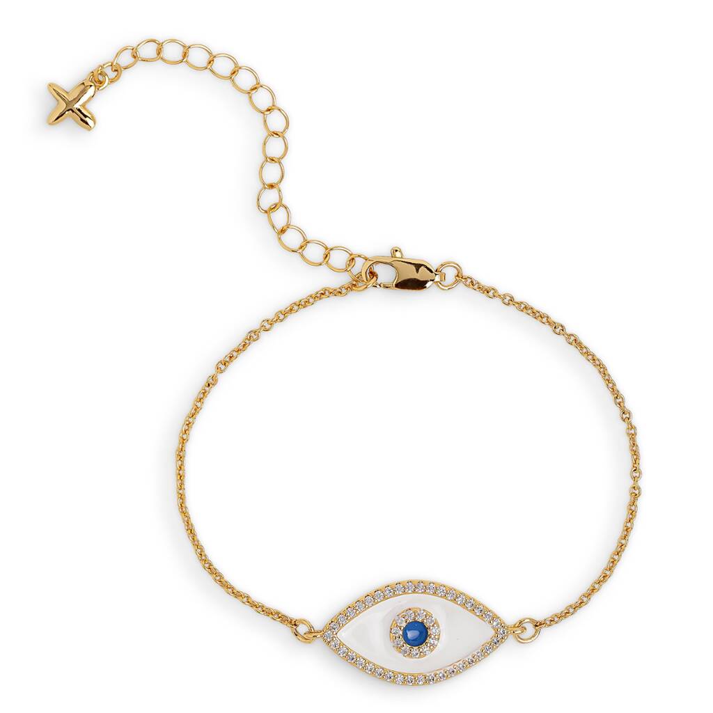 White Evil Eye Charm BraceletAdd a sparkly finish to your favourite looks with this pretty bracelet. Designed with a bold evil eye charm coated with smooth white enamel and topped with a navy-blue centre, this playful bracelet is made to protect you from evil and show off your personality. The blue and white combo is the ultimate calming duo – style yours with lots of colourful pieces for a layered look.