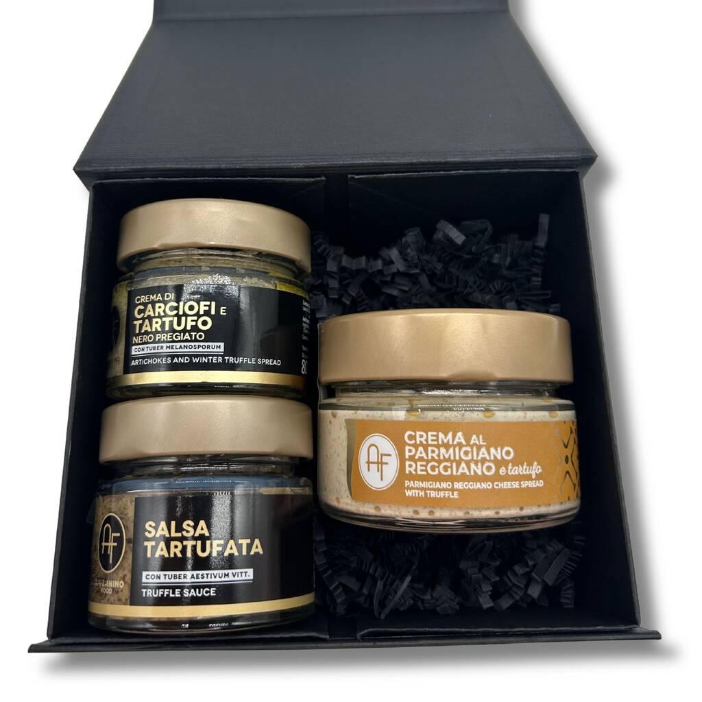 Inside you’ll find our Artichoke and Black Winter Truffle Dip, Truffle Sauce, and Parmigiano Reggiano and White Truffle Cream. Presented in a sleek black gift box, this collection makes a delicious gift for food lovers or an indulgent treat for your own pantry.
