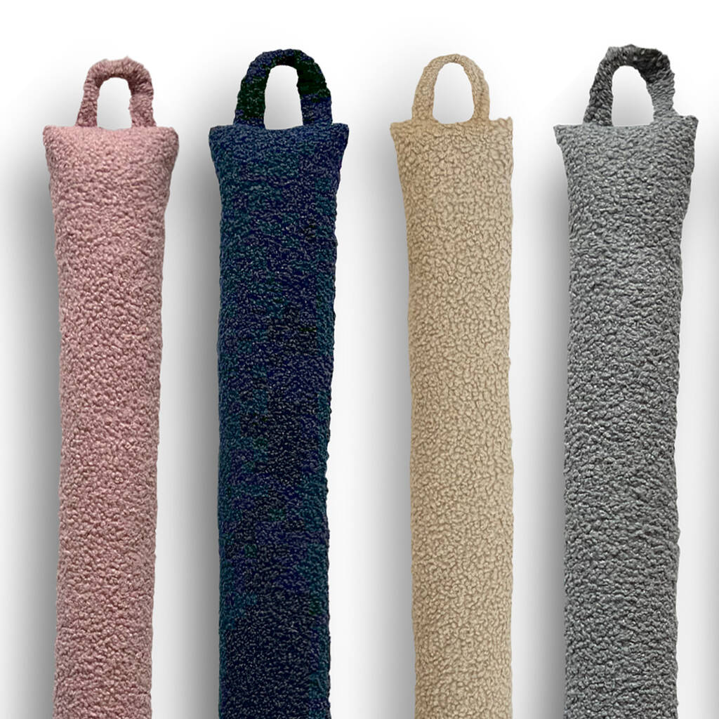 They are filled with organic buckwheat hulls - which are triple screen graded and then force air cleaned. This filling allows the excluder to shape into the space that it is filling, ensuring effective blocking of draughts. Each one also has a handy loop on one end, allowing it to be hung whilst not in use.