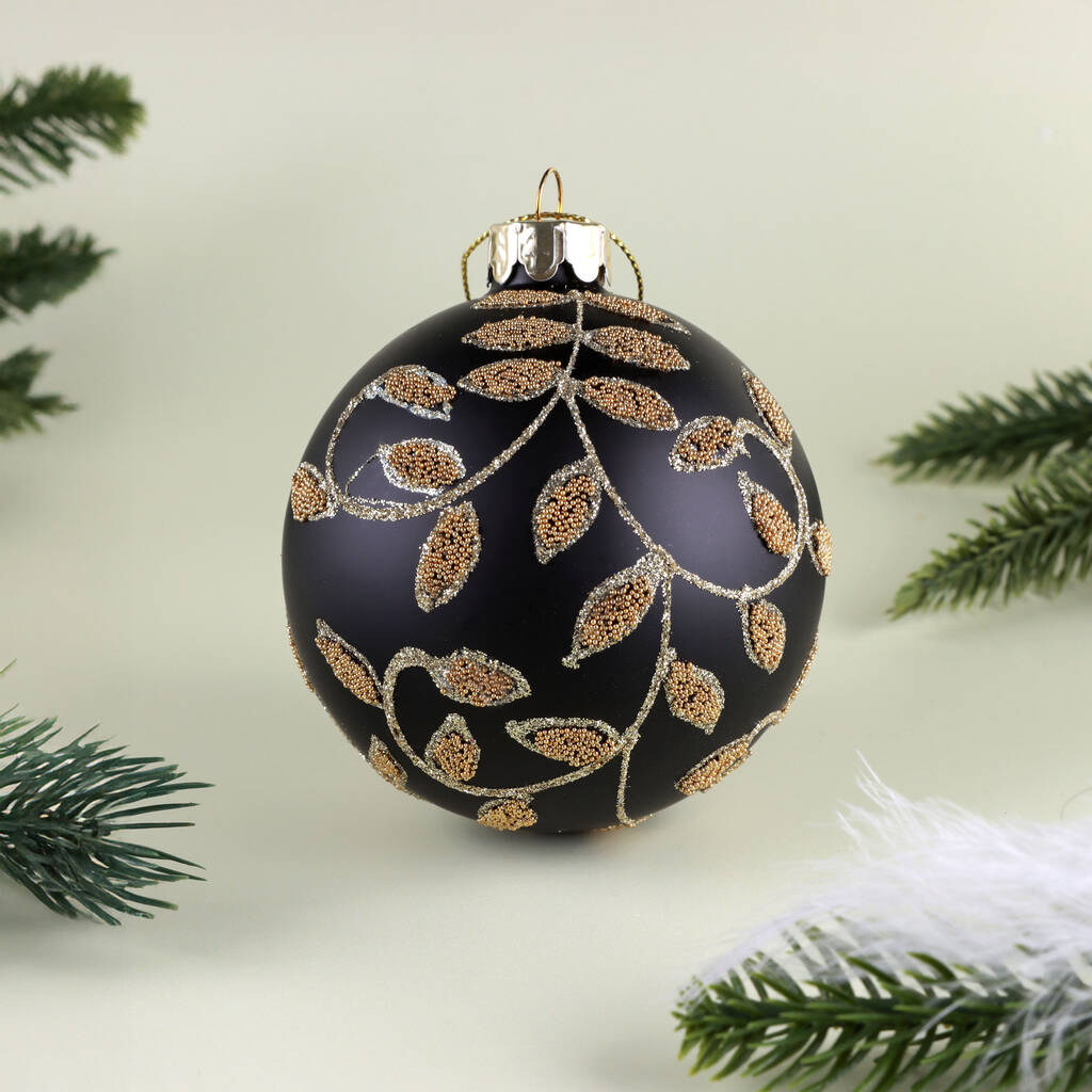 G Decor Black And Gold Leaf Luxury Glass Christmas Bauble Hand Decorated Festive Ornament