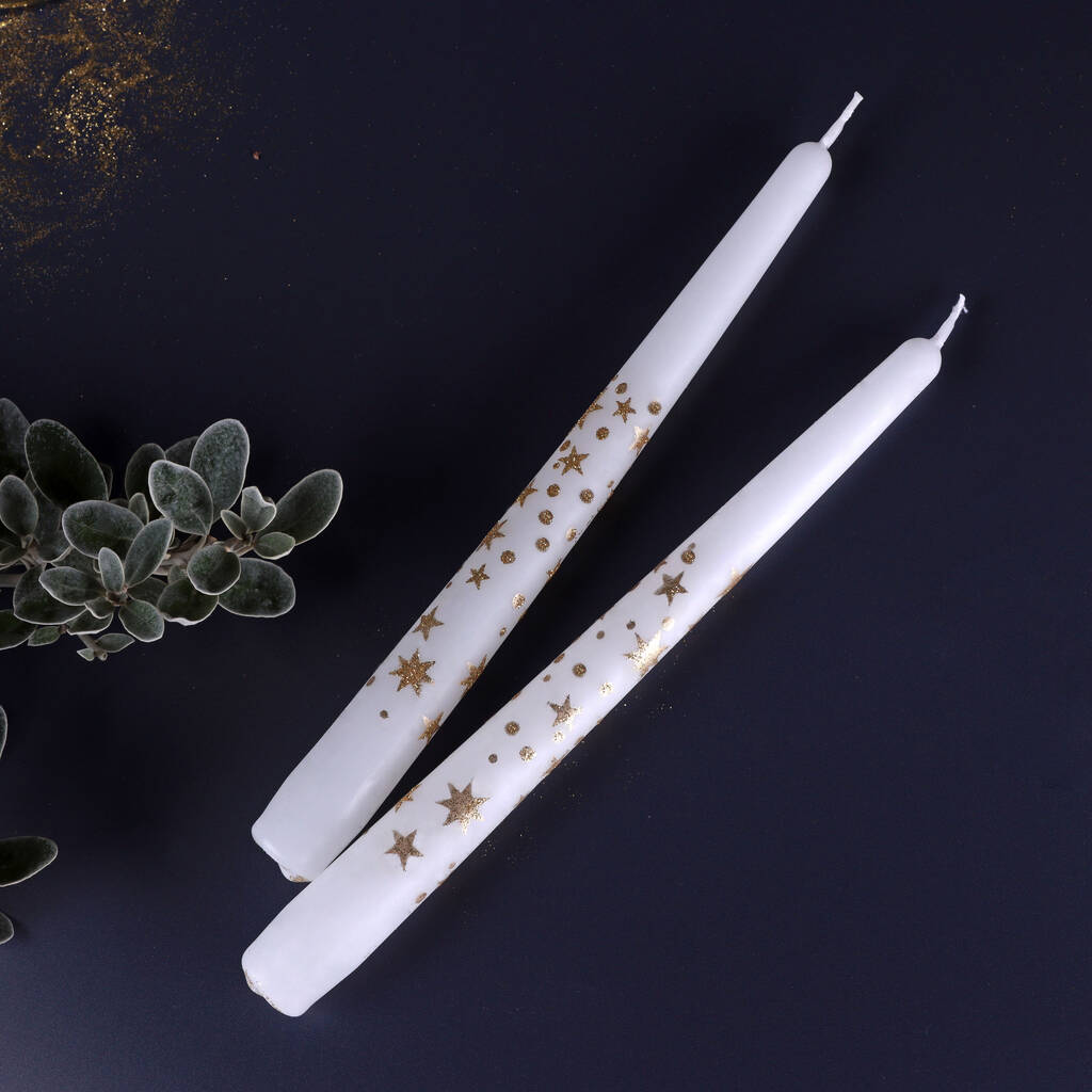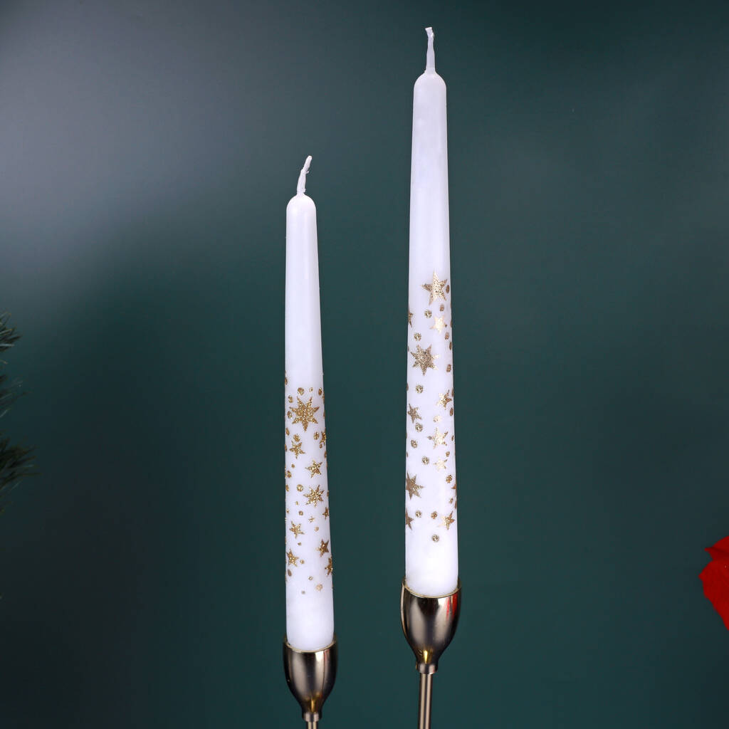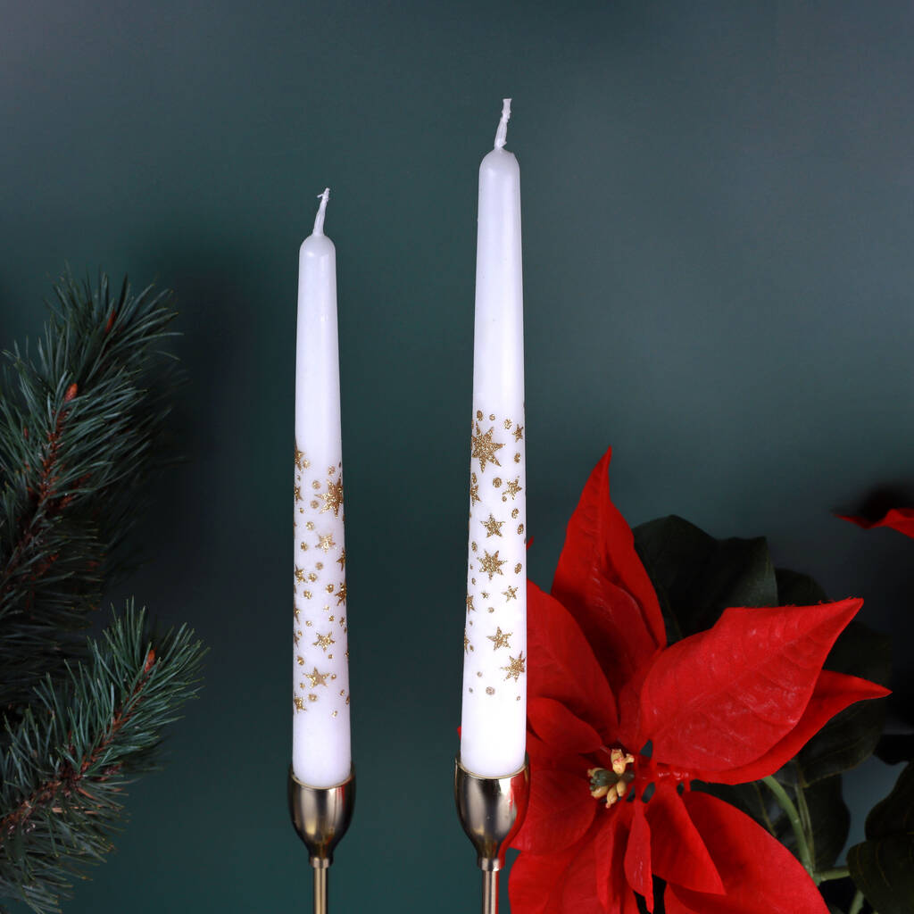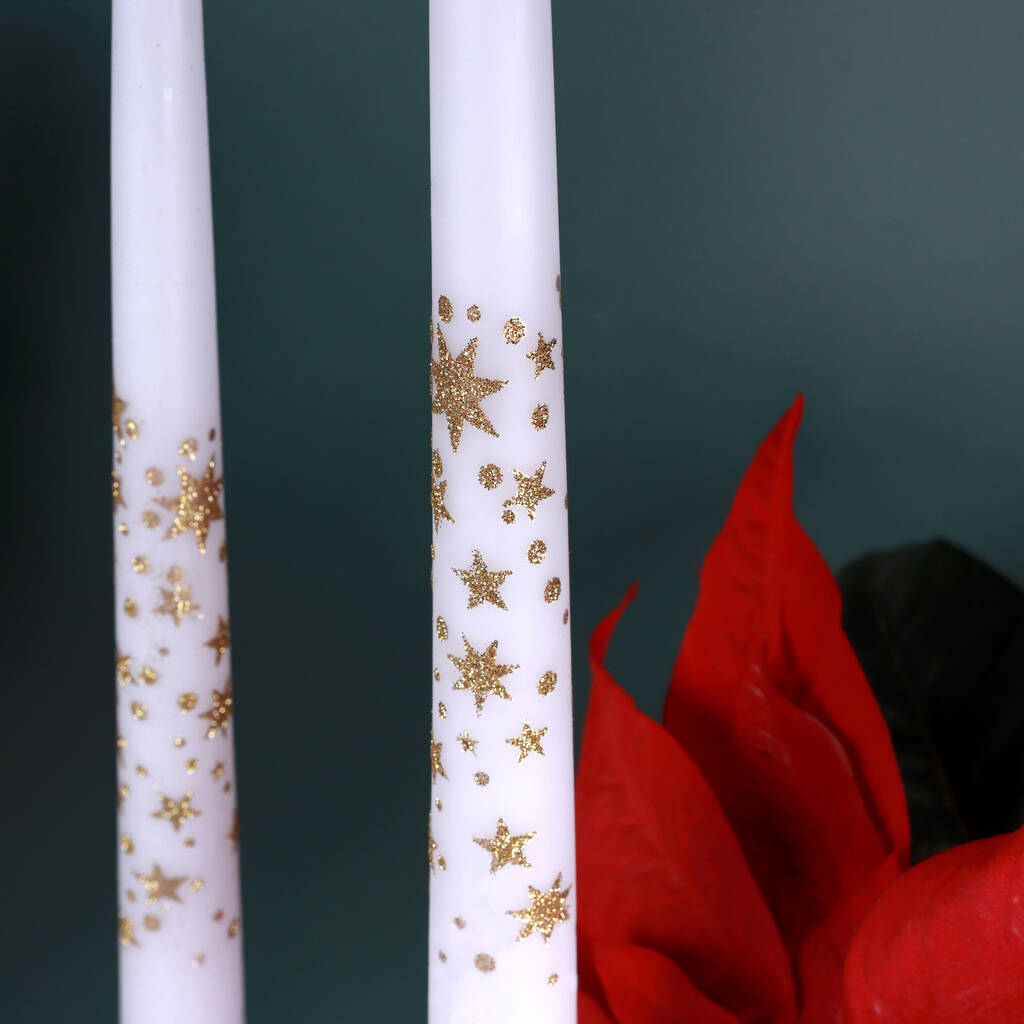 A slender pair of white dinner candles, delicately adorned with hand-finished gold glitter stars, brings a sense of occasion to any setting.