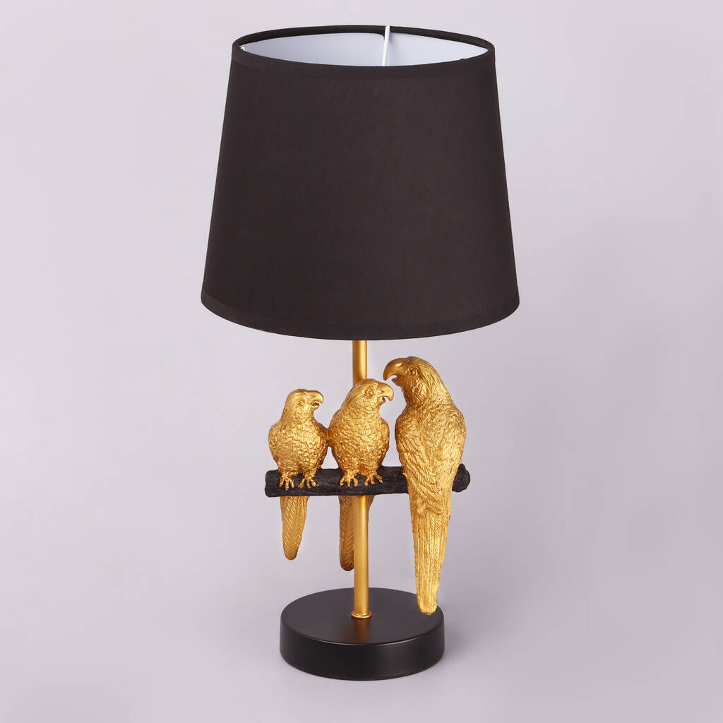 Three finely modelled parrots are crafted in ceramic and finished in a warm gold tone, forming a decorative centrepiece that feels expressive yet elegant. The ceramic base carries a beautiful sense of weight and texture, giving the lamp a grounded presence. The gold finish highlights the sculptural detailing of the parrots, allowing light to play softly across the surface throughout the day. Above, a cotton black fabric shade introduces a clean contrast — deepening the gold tones while keeping the overall silhouette beautiful and modern. When illuminated, the shade diffuses the light gently, creating a warm, comfortable glow suited to evening settings. The lamp is operated via a discreet on/off switch on the cable, making it both practical and easy to live with. The balance between the decorative ceramic base and the simple fabric shade gives the piece a thoughtful, contemporary feel that works beautifully in modern, design-led interiors. Aviary Doré is a lamp chosen for its harmony of materials and form. Decorative, playful yet polished, it brings character and luxury to bedside tables, consoles, and styled surfaces.