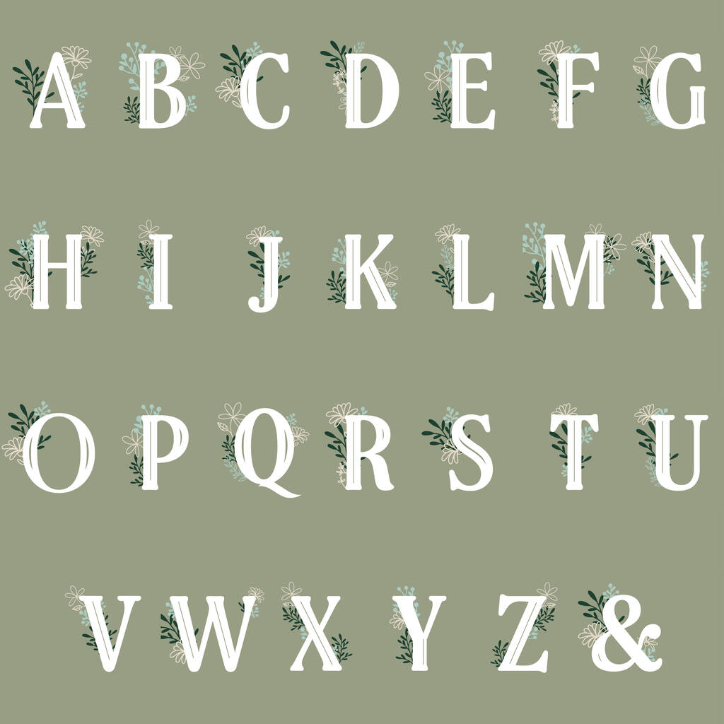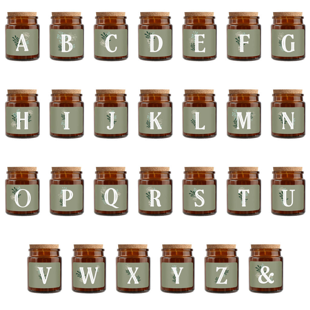 A beautifully designed monogram candle featuring a delicate botanical illustration wrapped around a bold floral letter for the entire alphabet from A - Z.