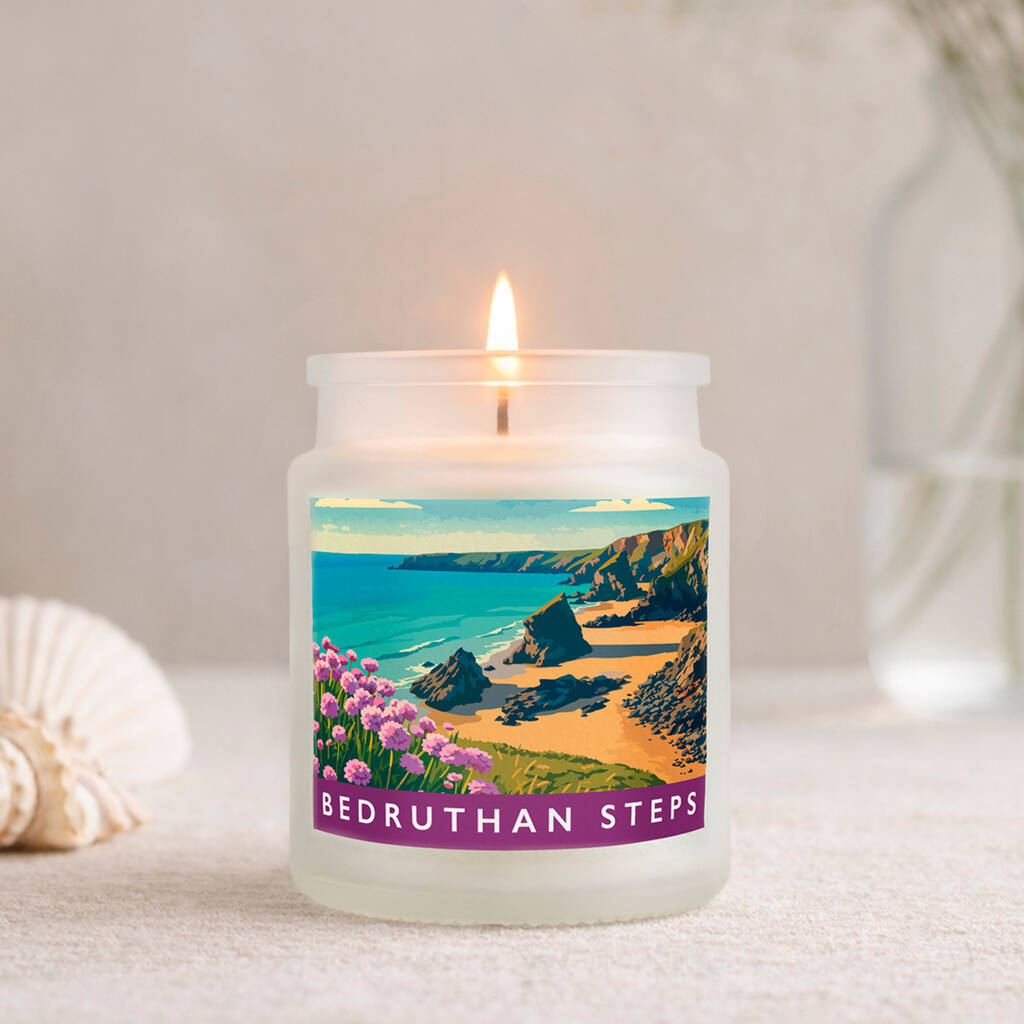 Beach: “Bedruthan Steps.” A breathtaking tribute to one of Cornwall’s most iconic coastal gems. Turquoise waters, dramatic rock formations, and wild natural beauty captured in a candle.