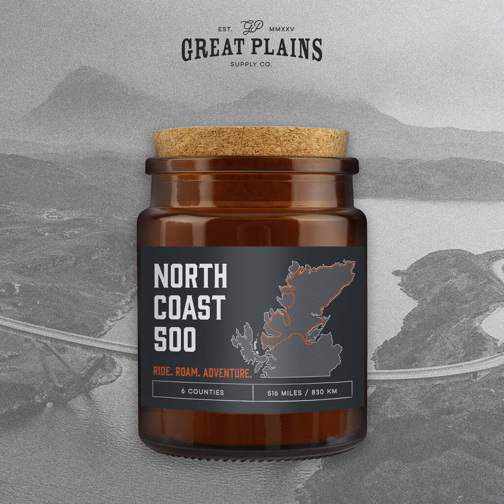 Slogan: “North Coast 500” — Ride. Roam. Adventure. Inspired by Scotland’s iconic 516-mile road trip around the wild northern Highlands, this candle celebrates breathtaking scenery, winding coastal roads and the freedom of the open road. Light it and feel the untamed spirit of the NC500 fill your home.