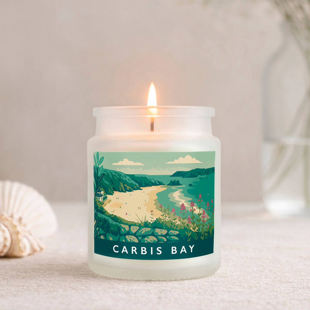 Slogan: “Carbis Bay.” A beautifully illustrated tribute to one of Cornwall’s most breathtaking beaches. Golden sands, turquoise waters, and that unmistakable coastal calm captured in a candle.