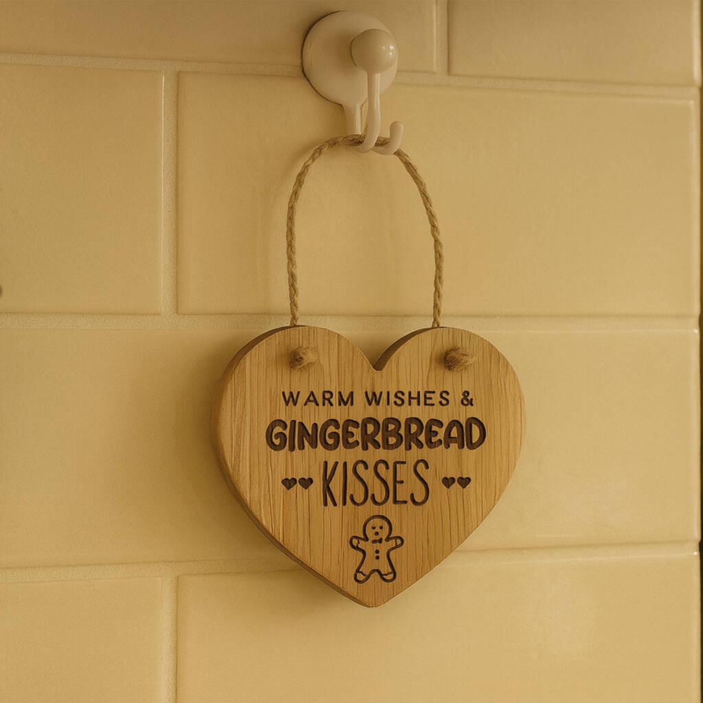 A delightful gingerbread illustration adorns the front, bringing a charming, cosy feel reminiscent of homemade Christmas treats. The heartfelt slogan, “Warm Wishes and Gingerbread Kisses,” is elegantly displayed, making it an inviting addition to any room.