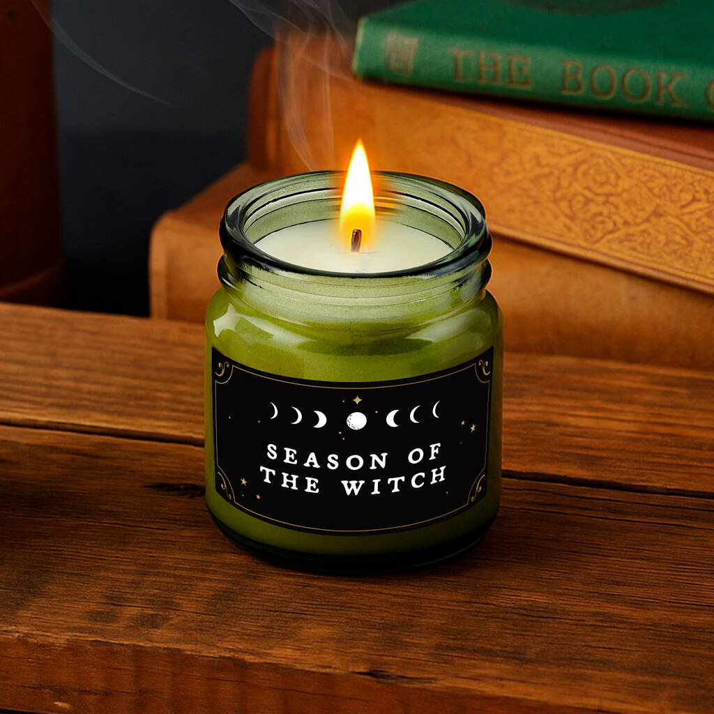 Slogan: “Season Of The Witch” — Celebrate the magic of the season with our Season of the Witch candle. Poured into a deep green glass jar and adorned with a celestial moon phase label, this enchanting candle is the perfect way to set the mood for rituals, autumn nights, or simply embracing your inner witch.