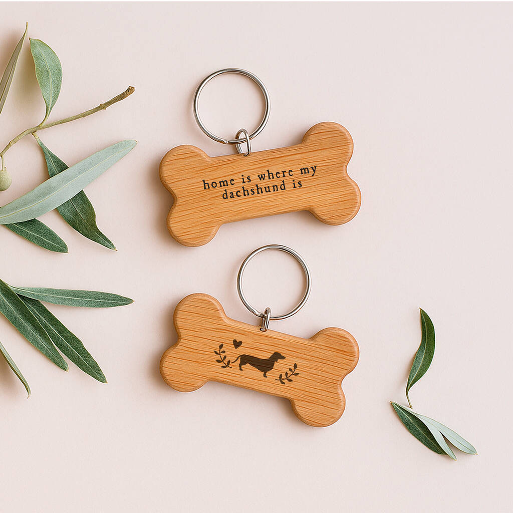 Introducing our Oak Bone-Shaped Keyring – “Home Is Where My Dachshund Is” with Dachshund Illustration – Perfect Gift for Dog Lovers.