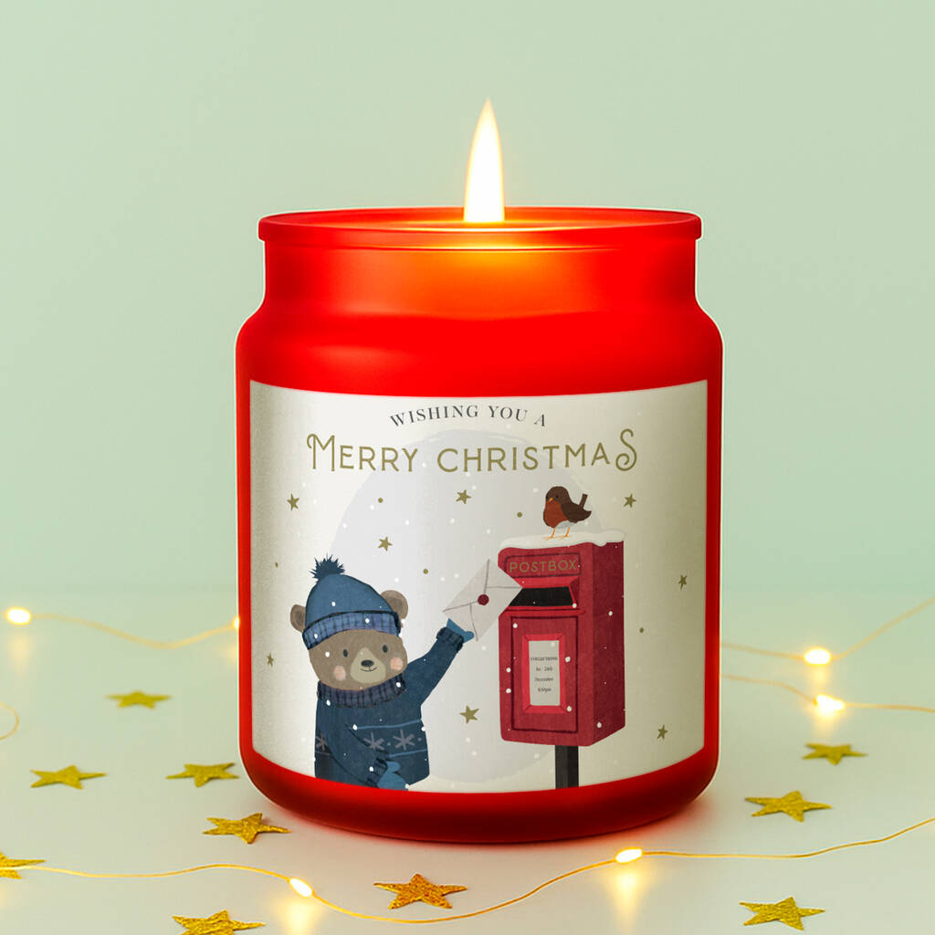 Candle Size: 9.2cm (H) x 7cm (W) - rich red glass jar adorned with a delightful illustration of a bear posting Christmas cards beside a bright red post box, with a robin perched on top.
