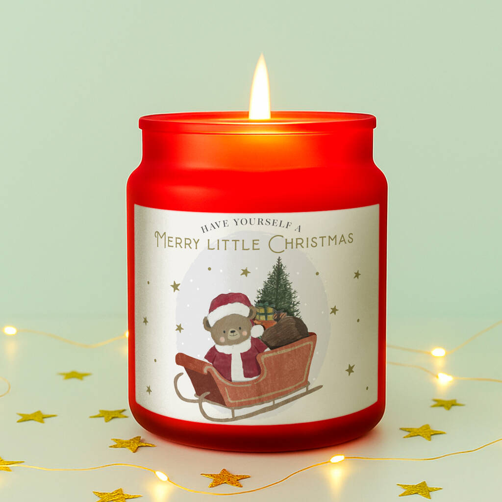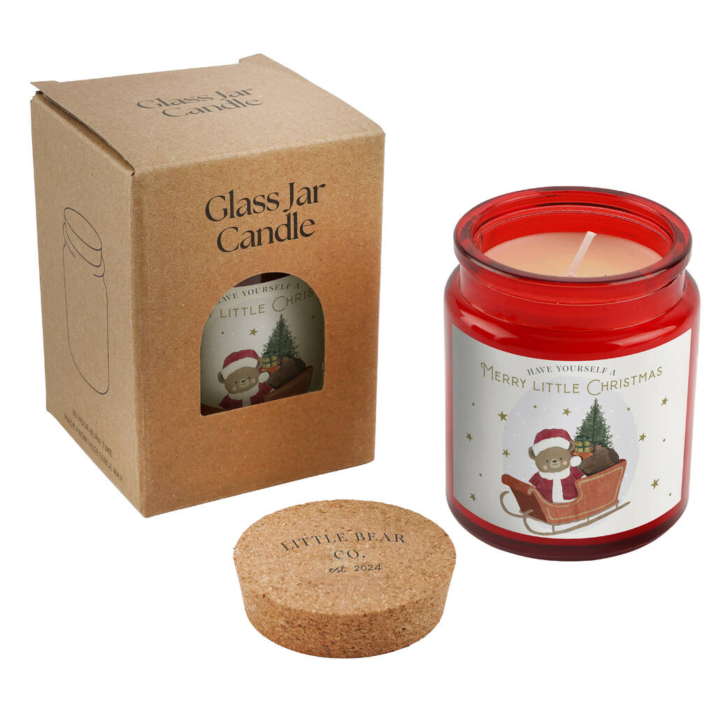 Candle Size: 9.2cm (H) x 7cm (W) - a vibrant red glass jar featuring an adorable bear dressed as Santa in a sleigh, bringing festive charm to any room.