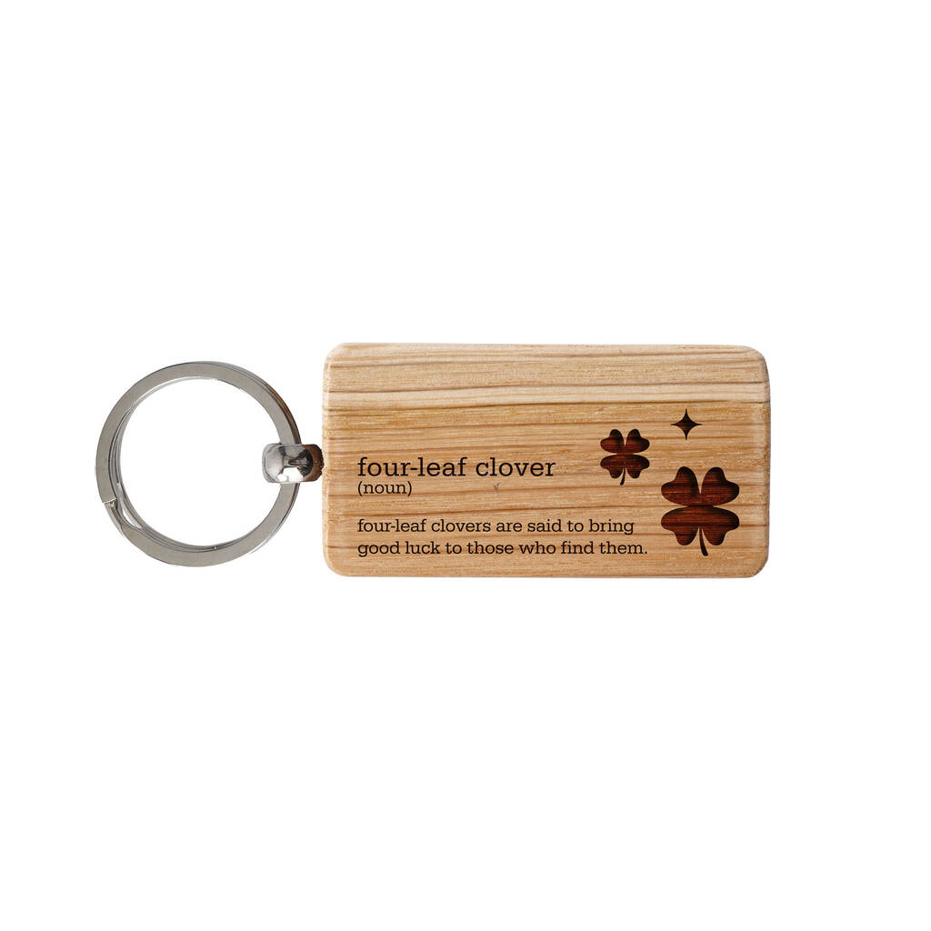 Bring a bit of Irish luck into your daily life with this charming rectangular oak keyring, engraved with the slogan 'Four-Leaf Clover' and the definiton - A four leaf clover is said to bring good luck to those who find them.