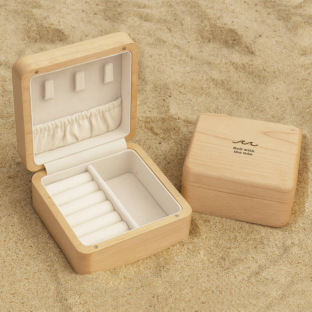 This elegant wooden jewellery box is engraved with the uplifting slogan “Roll With The Tide” and features a beautiful waves illustration on the lid.