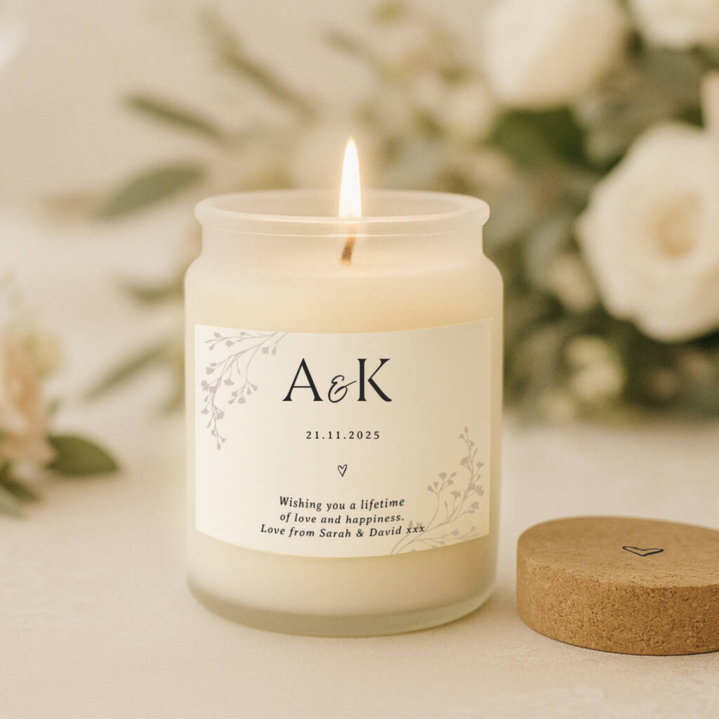 Slogan: Personalised Initials Wedding Candle. A thoughtful keepsake featuring the couple’s initials, wedding date, and your own special message to celebrate their big day.