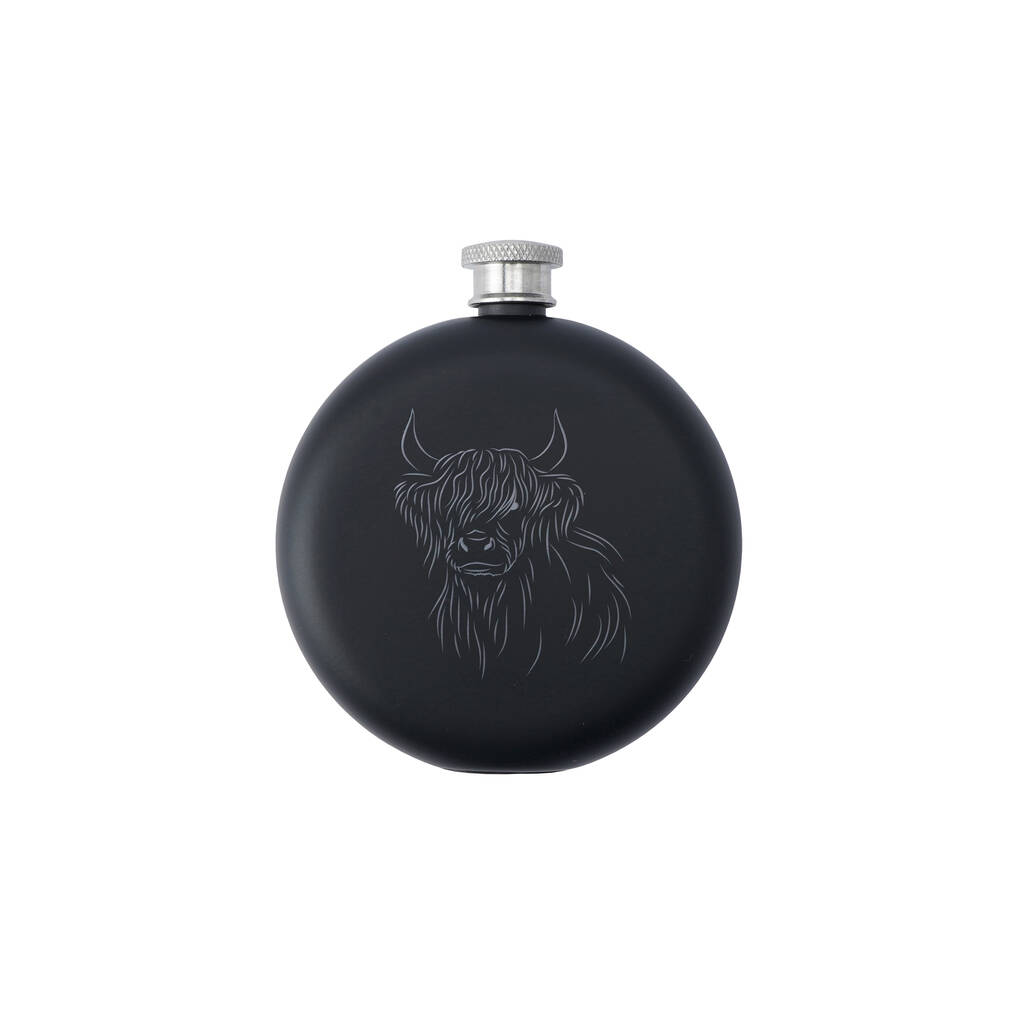 Introducing our Black Matte 6oz Hip Flask, a refined and stylish accessory with a distinctive touch—a meticulously etched Highland Cow design.