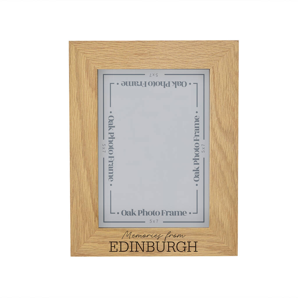Capture and display your cherished Scottish memories with this beautiful oak 5x7 photo frame, engraved with the heartfelt slogan “Memories From Edinburgh.”