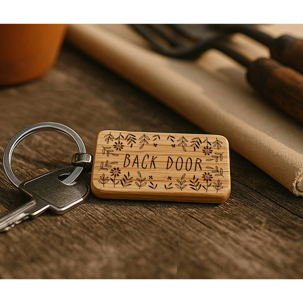 The keyring features a sturdy metal ring that securely holds your keys, ensuring that you have easy access to your essentials. The rectangular shape provides a modern and minimalist look, while the "Back Door" slogan, elegantly engraved on the oak surface, adds a touch of personality and charm.